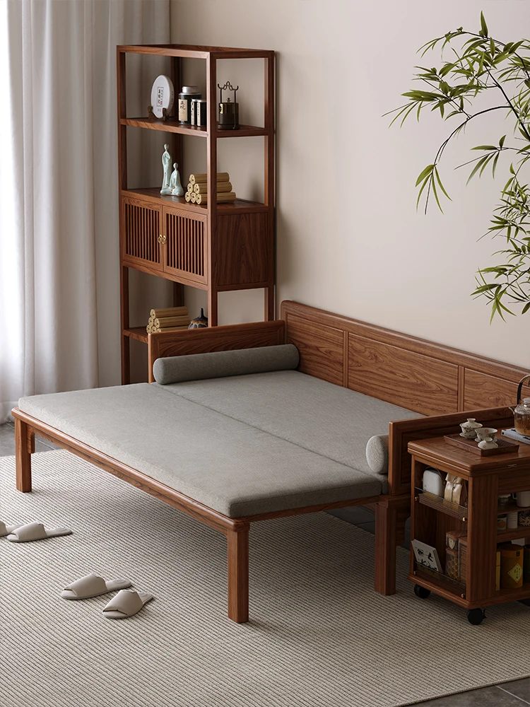 新中式デザインの北米産ブラックウォールナット無垢材ソファ・ロハンベッド。シンプルでありながら贅沢な雰囲気を演出し、洗練されたインテリアにぴったりの家具セット!