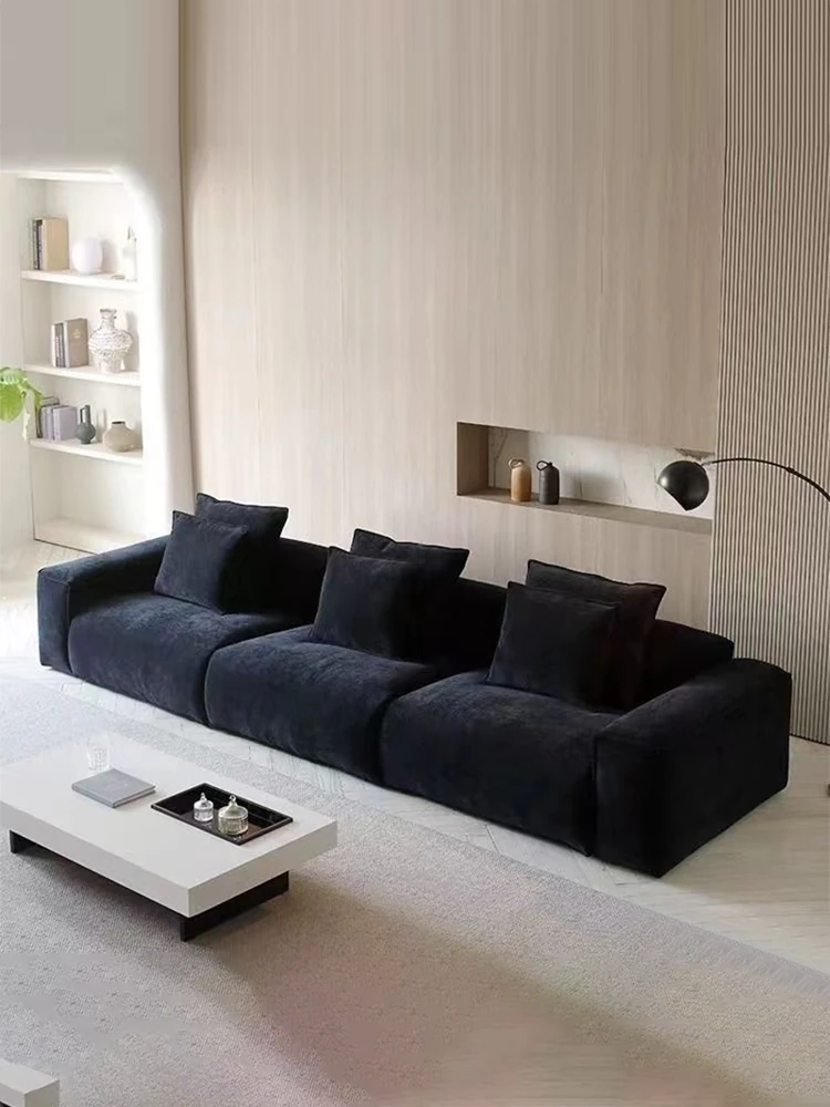 モダンなライトラグジュアリー、イタリアンミニマリズムのシンプルなデザイン!小型リビングに最適なチュニックブロックスタイルのブラックファブリックソファ。心地よい雪ニール素材でリラックス空間を演出。