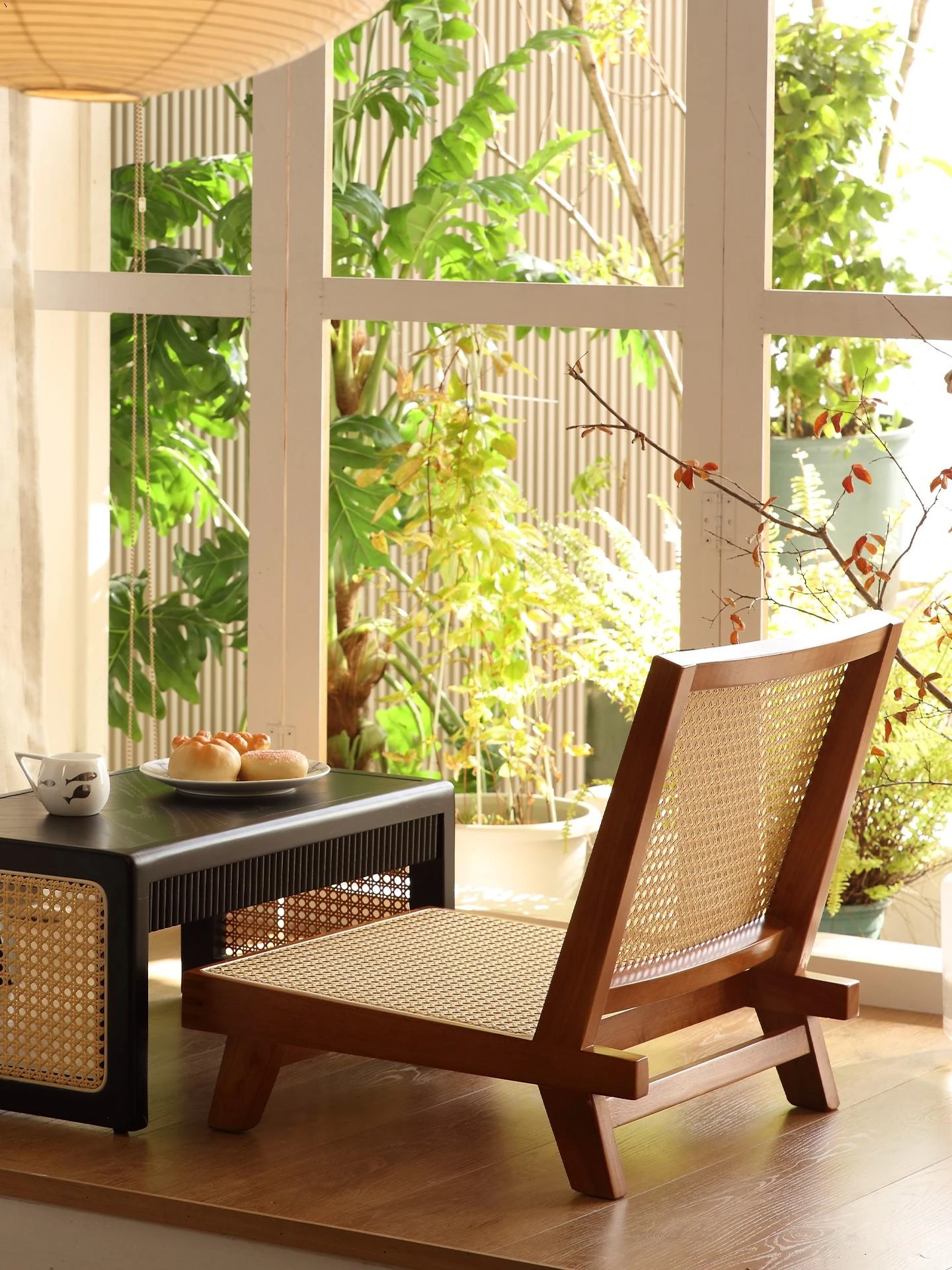 中式飘窗榻榻米原木製の藤編み座椅子 - 侘寂の美を感じるレトロな一人掛けソファ、バルコニーや茶室にぴったりな背もたれ付きの低いスツール。心安らぐひとときをお楽しみください。