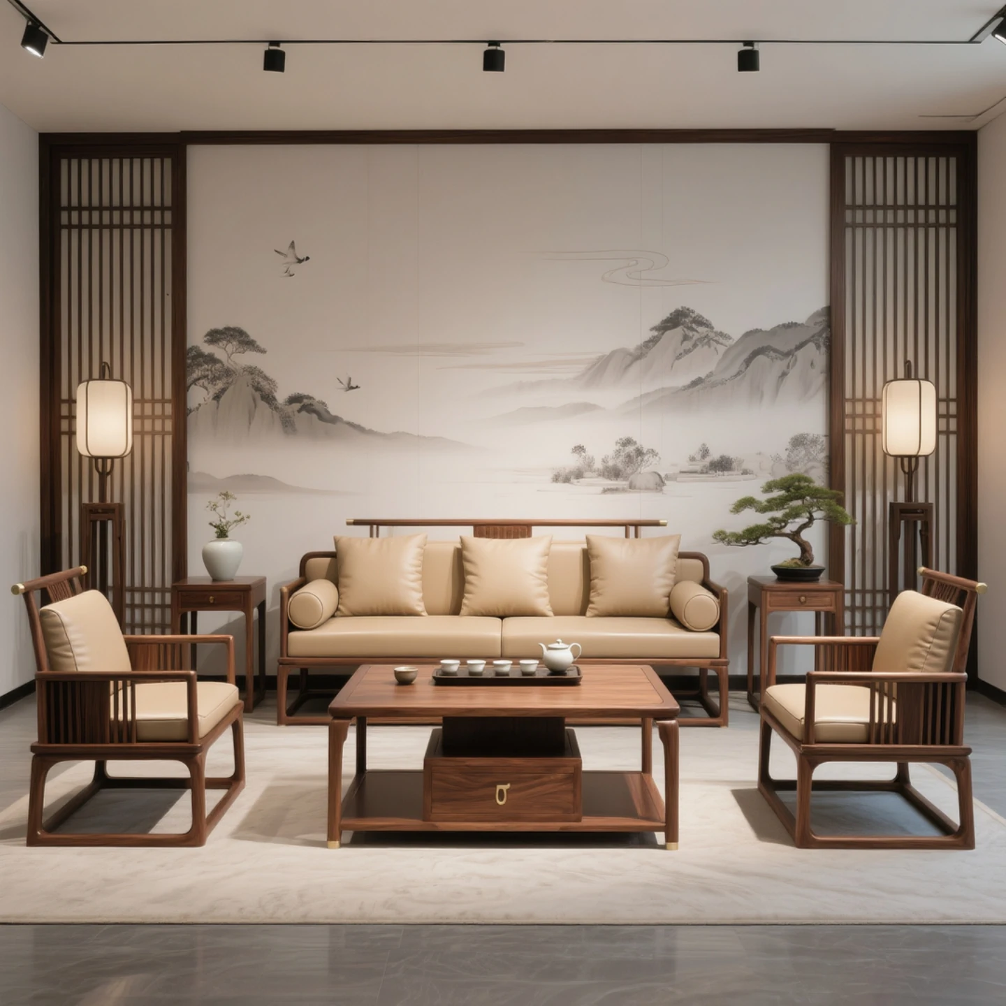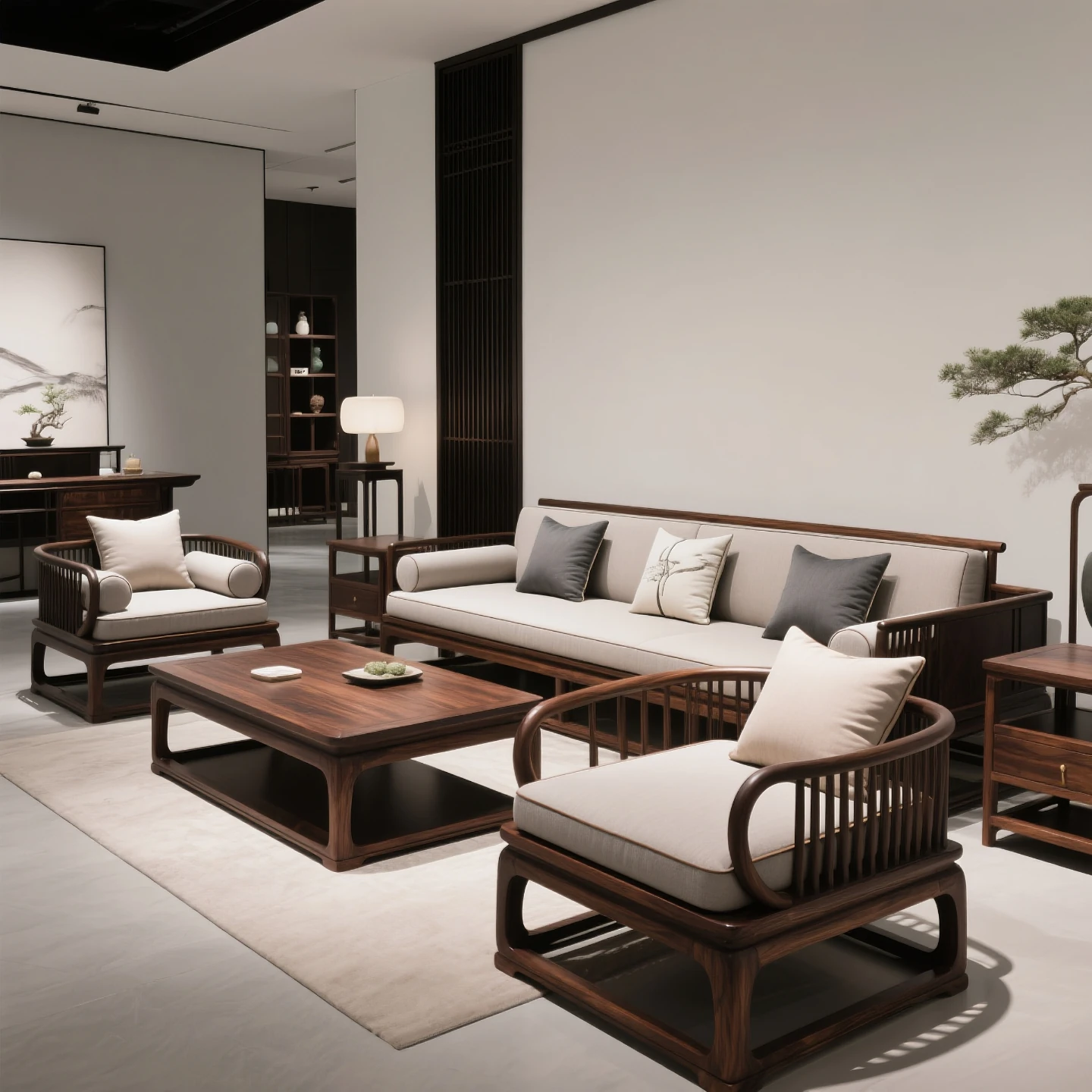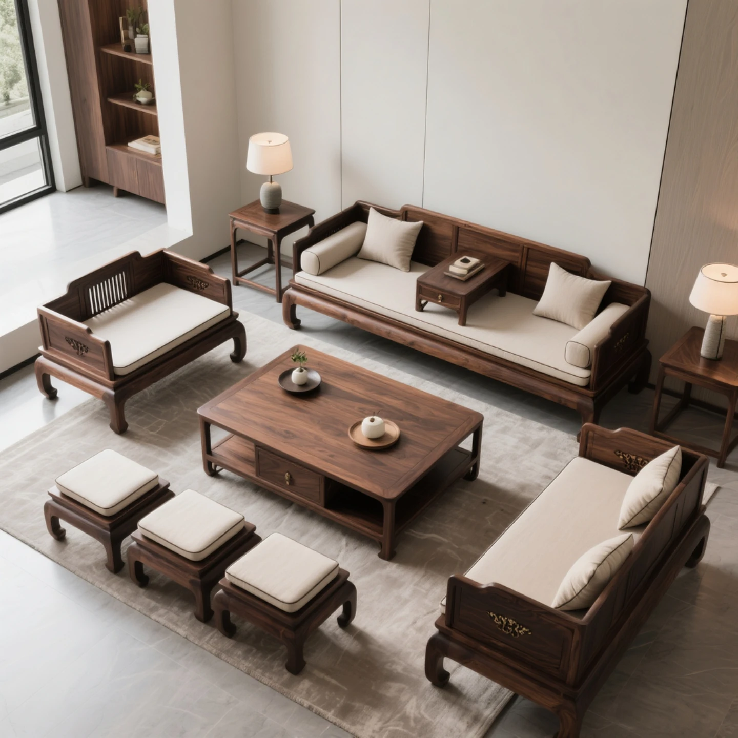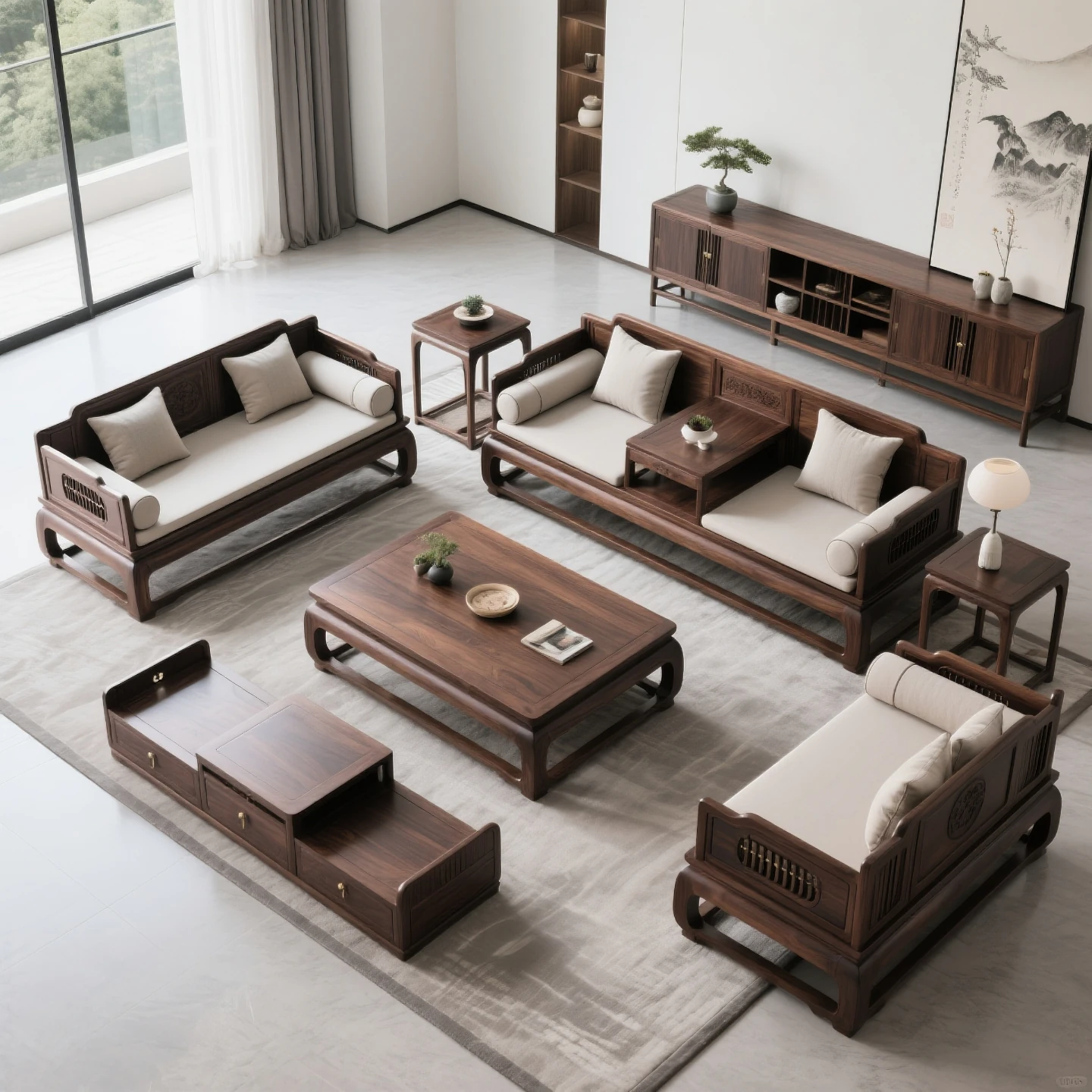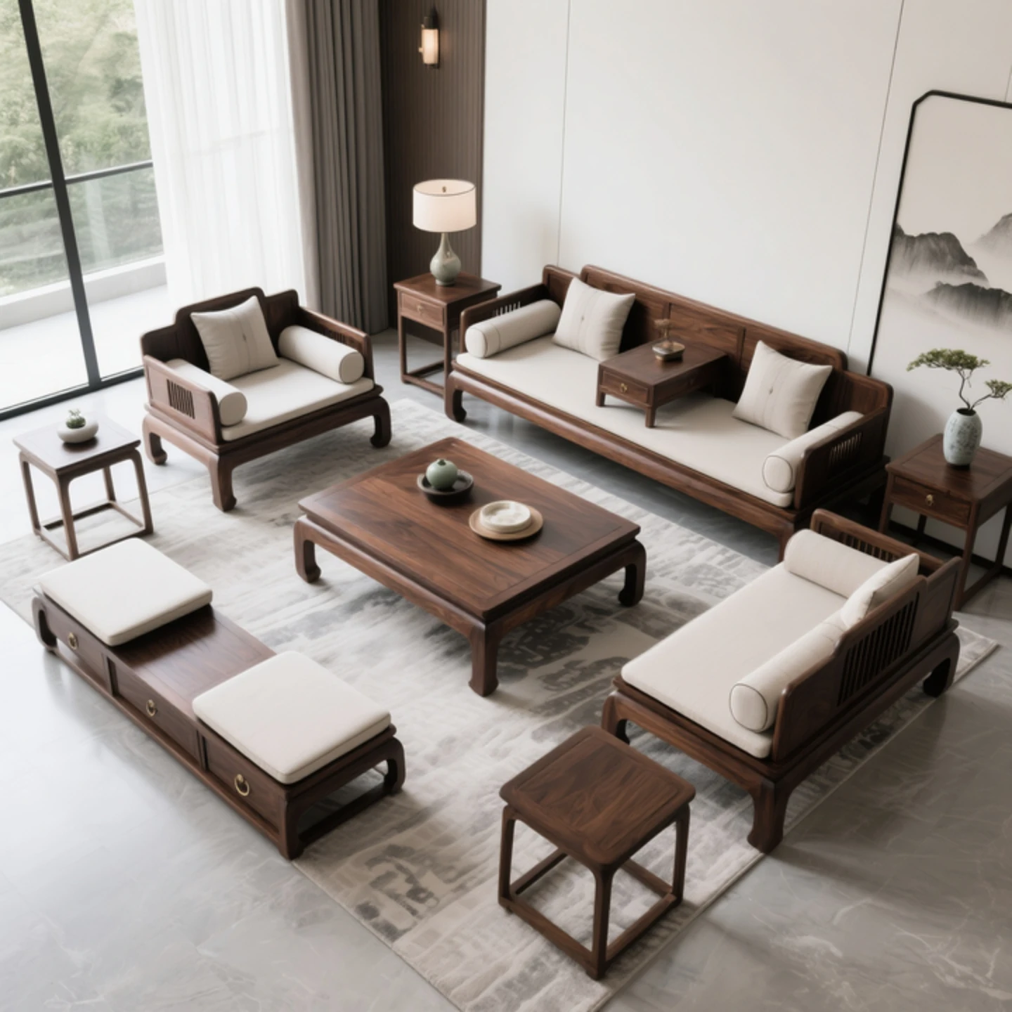 Stylish New Chinese-Style Sofa Set in North American Black Walnut – Elegant Solid Wood Living Room Seating with Song Dynasty Aesthetics for Office Reception and Guest Areas