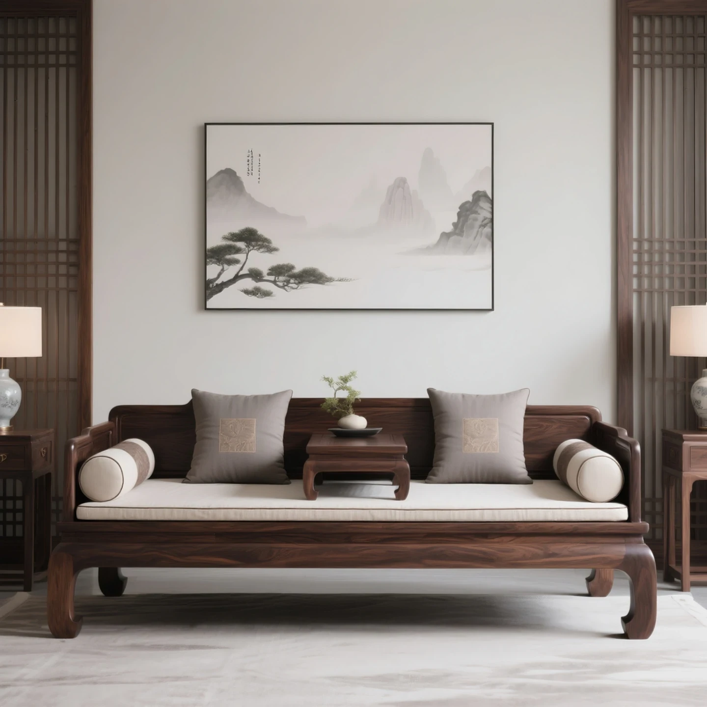 New Chinese Style North American Black Walnut Rohan Sofa - Minimalist Solid Wood Daybed for Small to Medium Living Spaces, Perfect for Model Homes