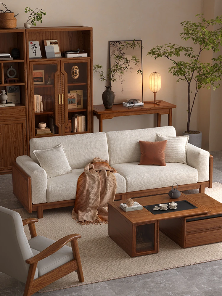 North American Black Walnut Solid Wood Corner Chaise Lounge Sofa Set - New Chinese Minimalist Zen Style Fabric Design for Small to Large Living Rooms