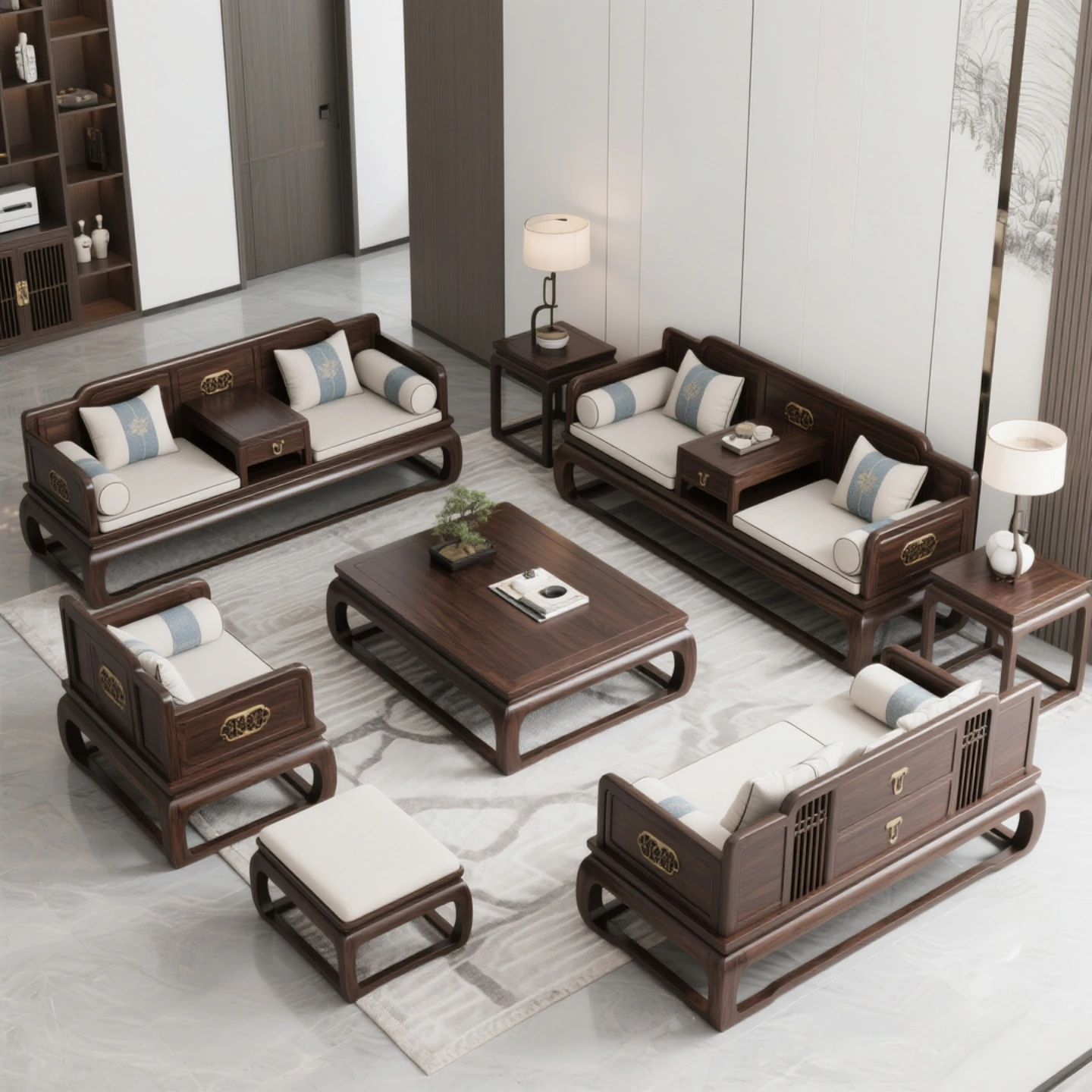 Modern Chinese Style Black Walnut Solid Wood Sofa Set for Living Room - Versatile Zen Design for All Seasons, Perfect for Villas and Various Home Sizes