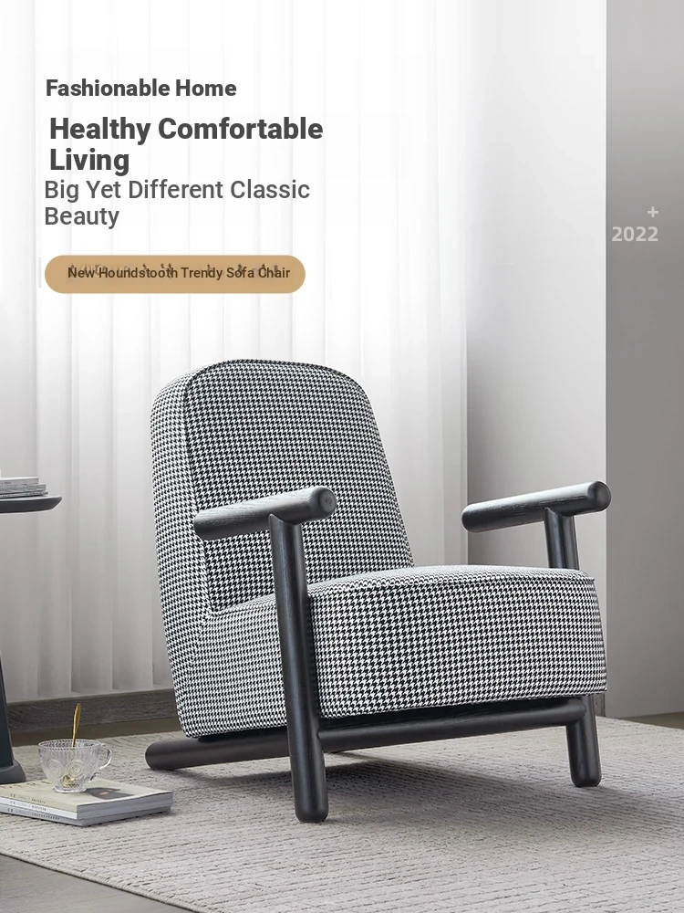 Solid Wood Single Sofa Chair - Stylish Armchair for Home, Living Room, and Balcony. Features a Chic Houndstooth Pattern, Perfect for Relaxation and Leisure. Ideal for Lazy Days!