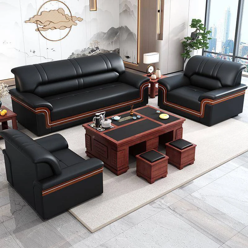 Premium Top-Grain Leather Sofa Set for Business Reception - Modern 3-Seat Sofa with Coffee Table Combination, Perfect for Stylish Meetings and Comfortable Conversations.