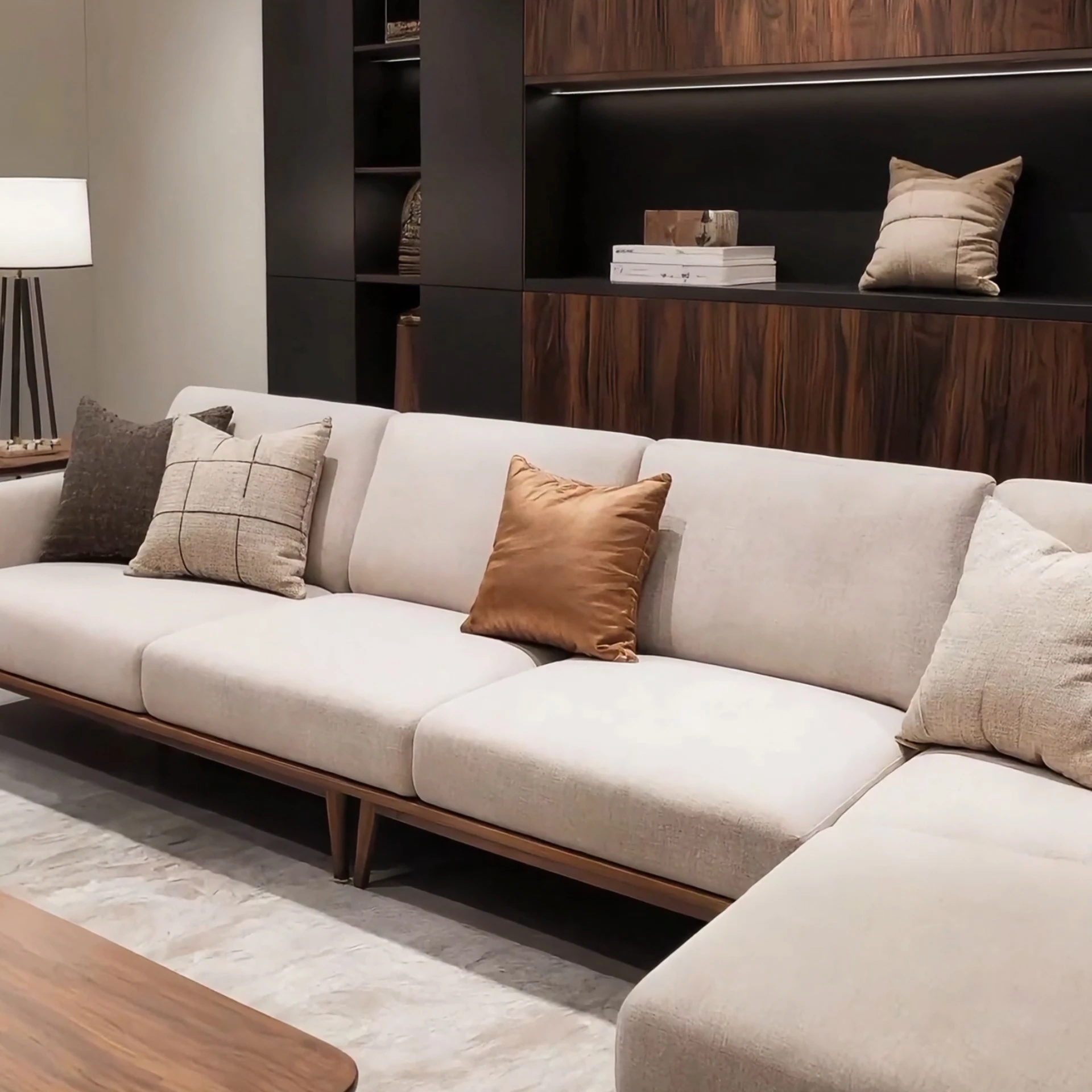 Modern Minimalist North American Black Walnut Sofa and Coffee Table Set with Fabric Corner Sofa and Solid Wood Chaise Lounge for Living Room