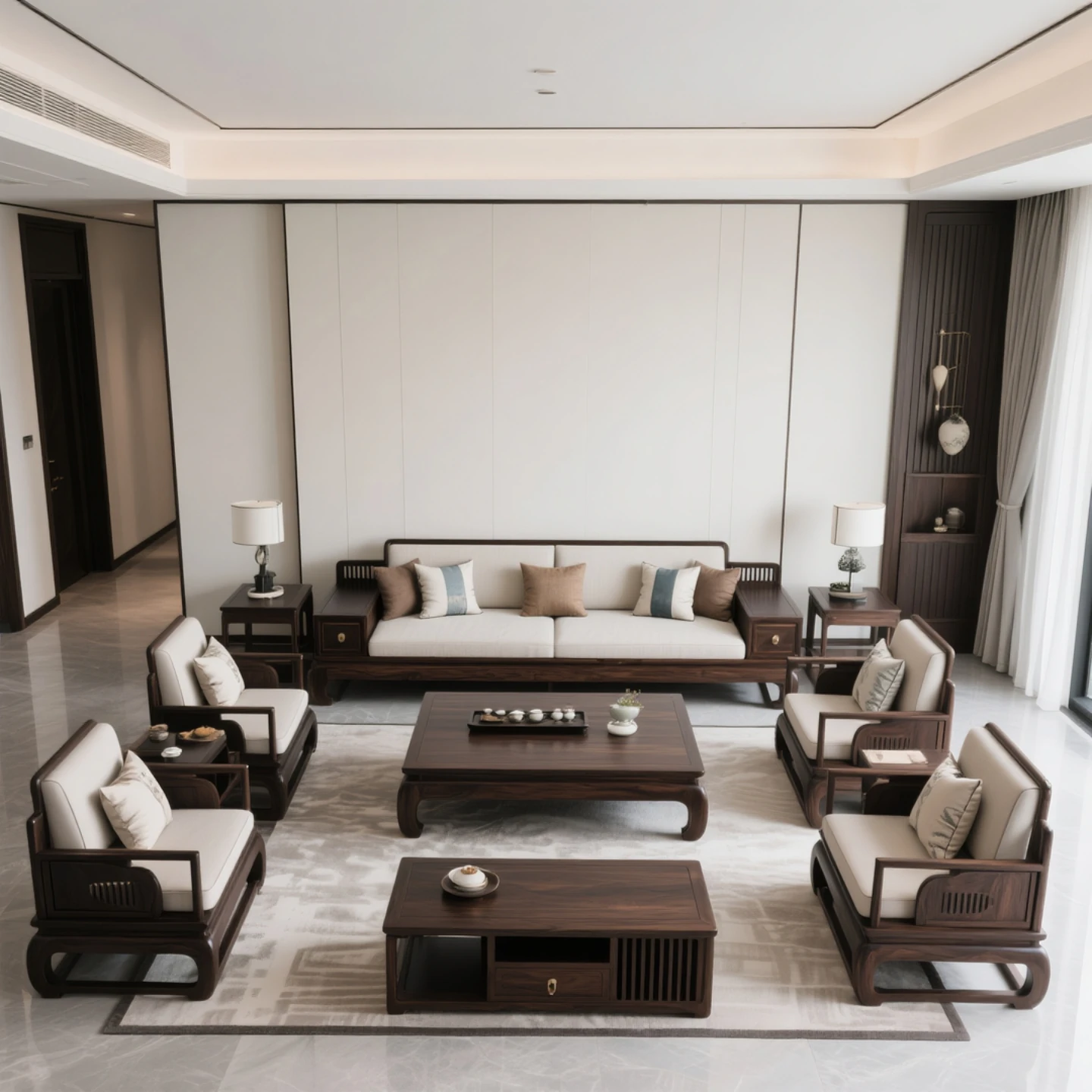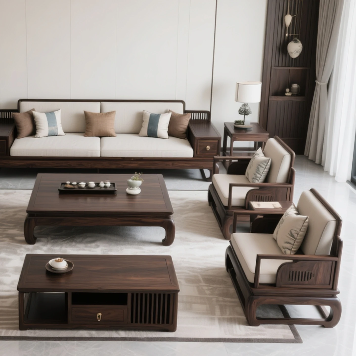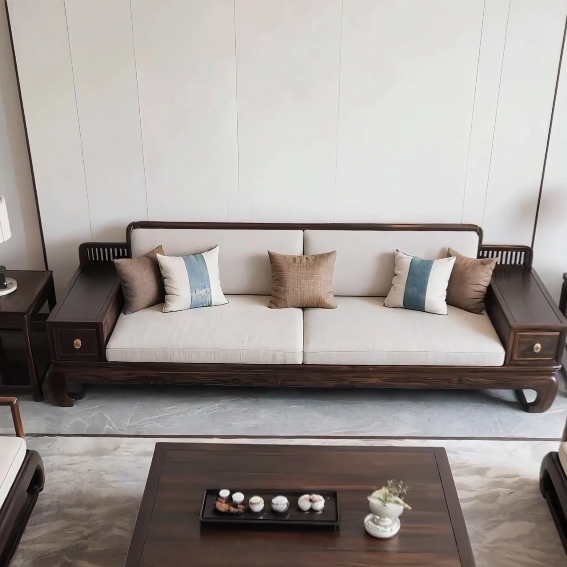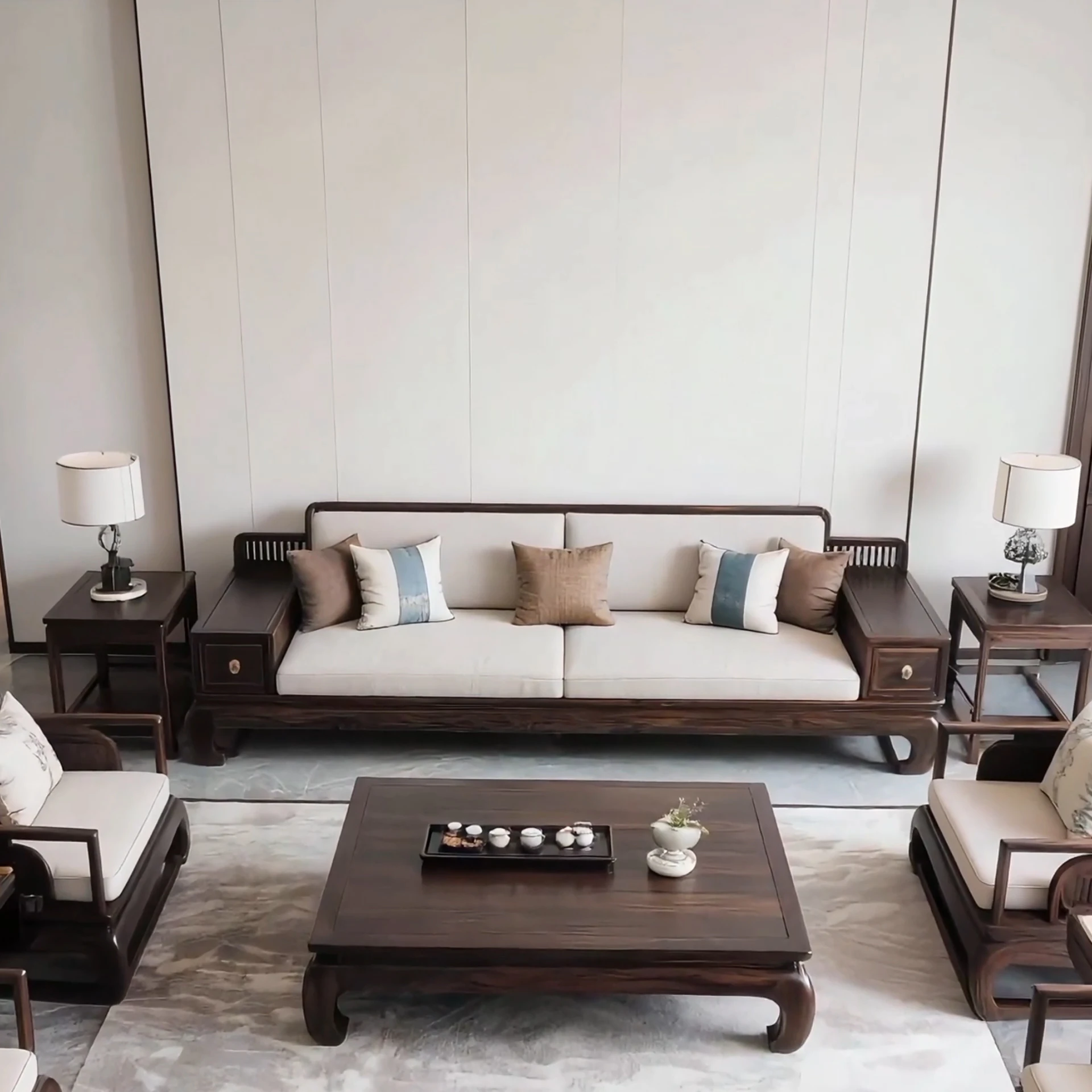 New Chinese Style North American Black Walnut Luohan Bed Solid Wood Sofa and Coffee Table Set - Elegant Fabric Design for Song's Villa Showroom