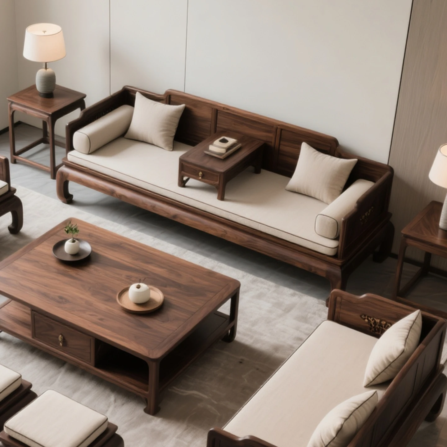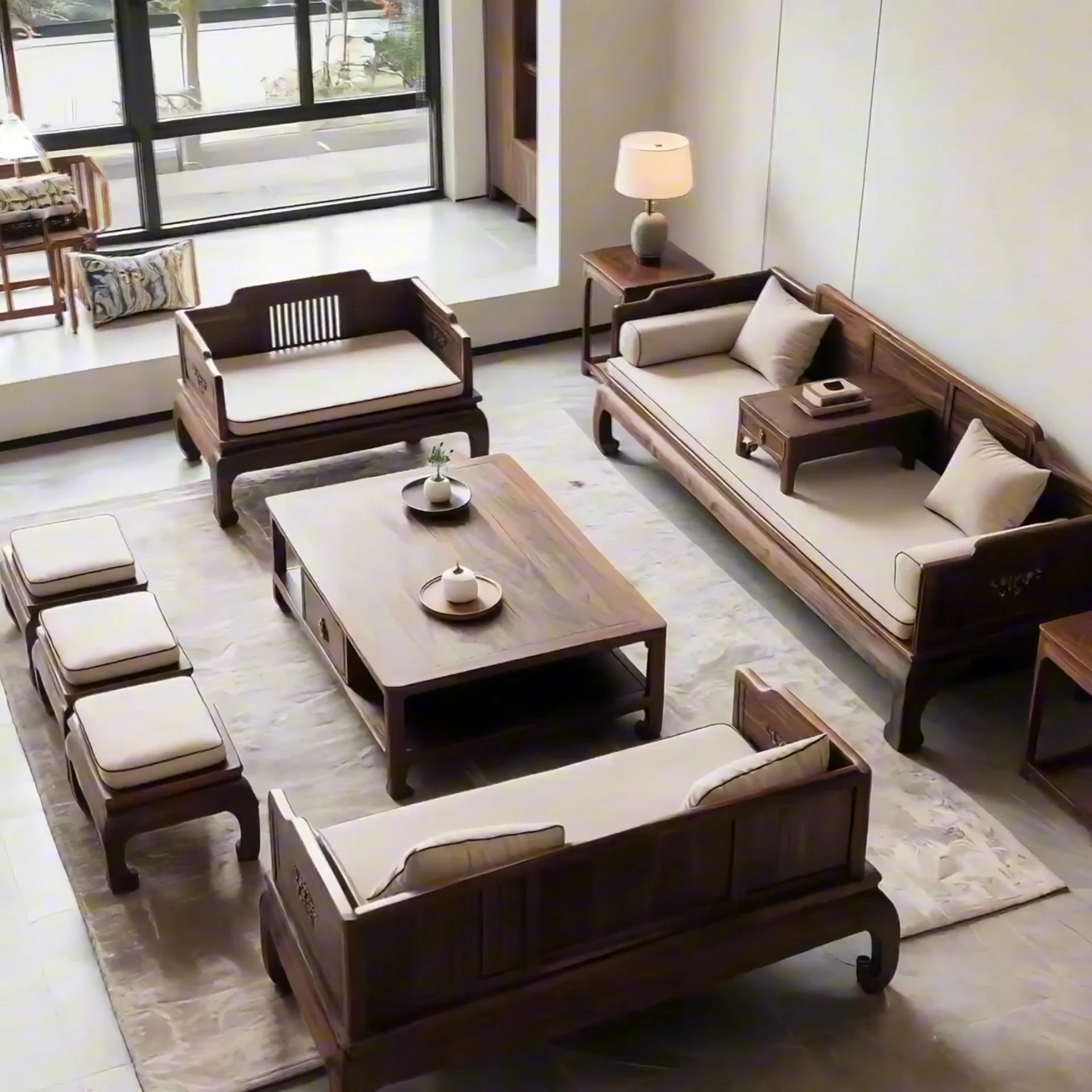 New Chinese Style North American Black Walnut Luohan Bed Solid Wood Sofa Coffee Table Set - Song Style Villa Sample Room Furniture