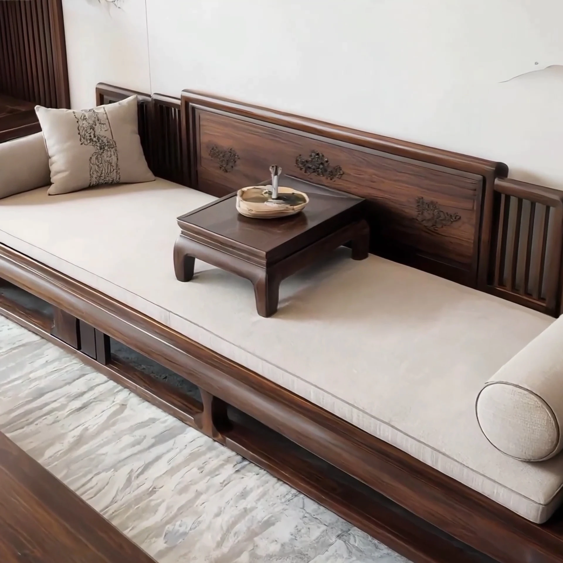 New Chinese Style Rohan Bed and Coffee Table Set - Solid Black Walnut Sofa Bed for Model Rooms and Guesthouses