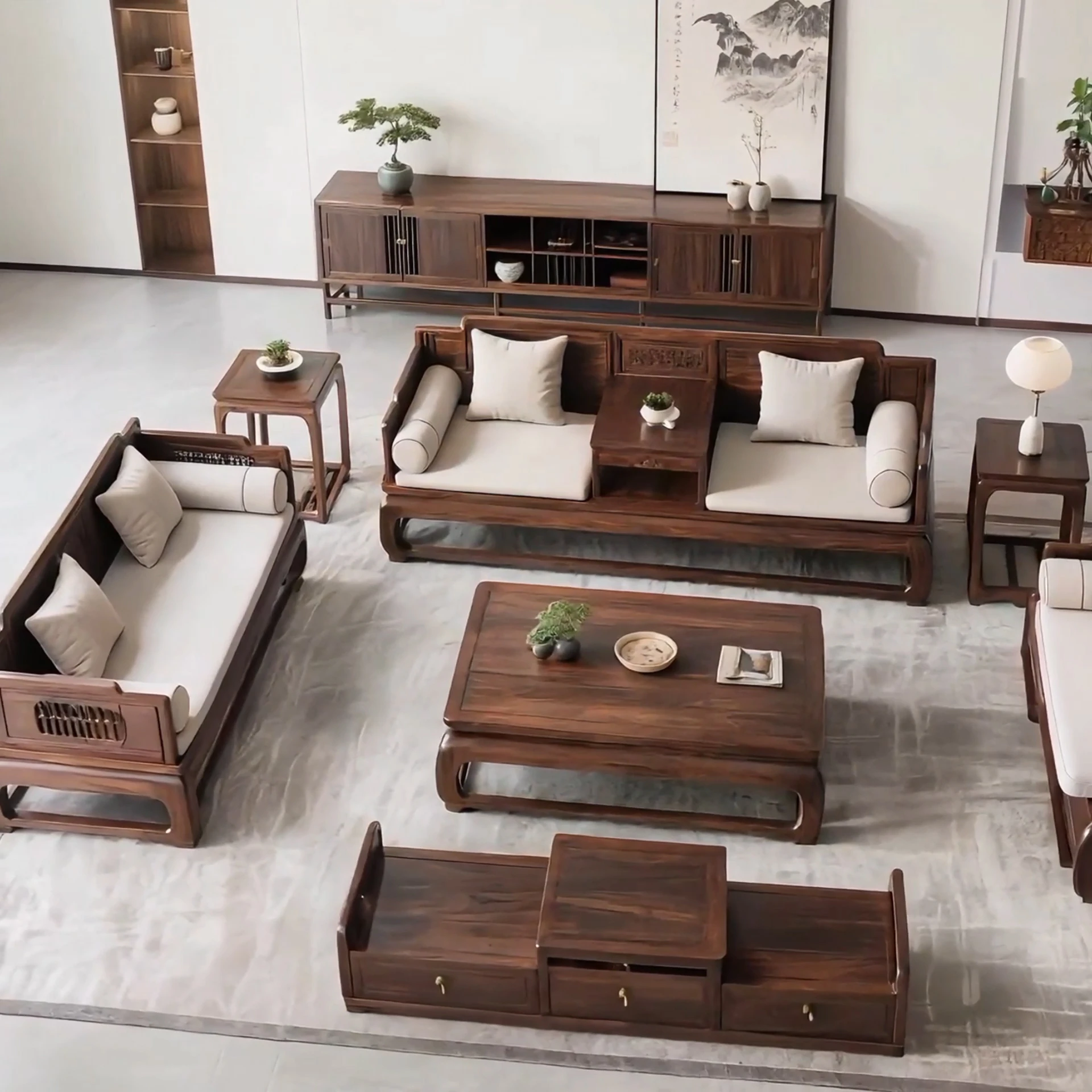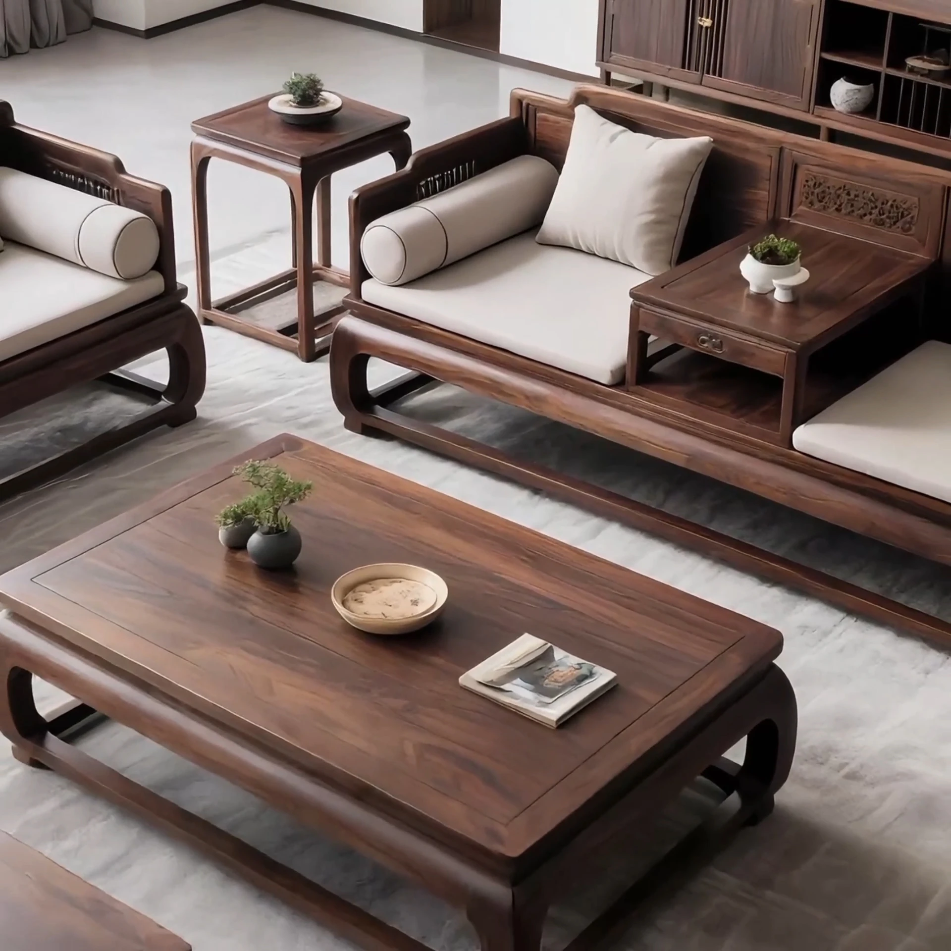 New Chinese-Style Rohan Bed and Coffee Table Set - Solid North American Black Walnut Sofa Bed for Model Homes and Airbnb Furniture