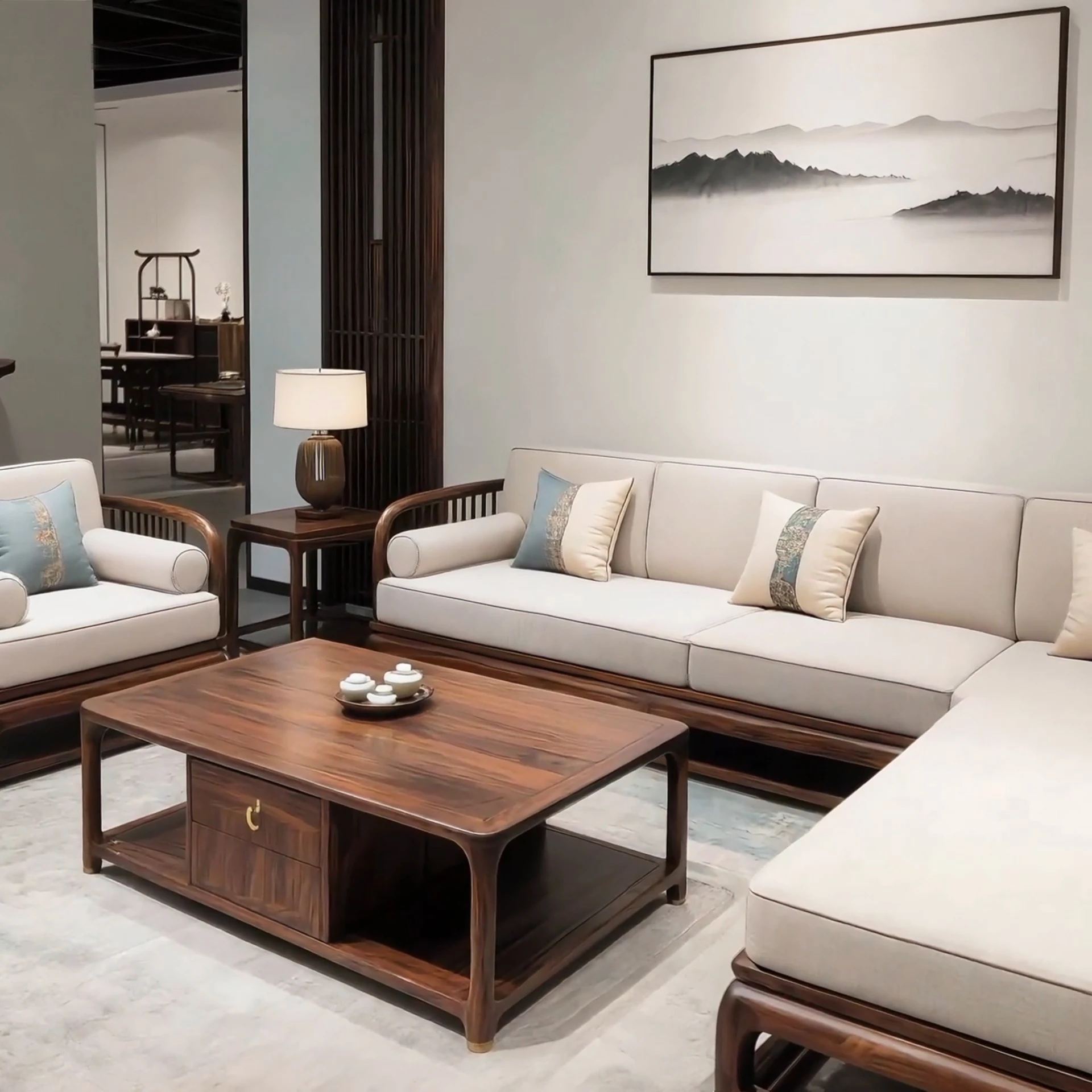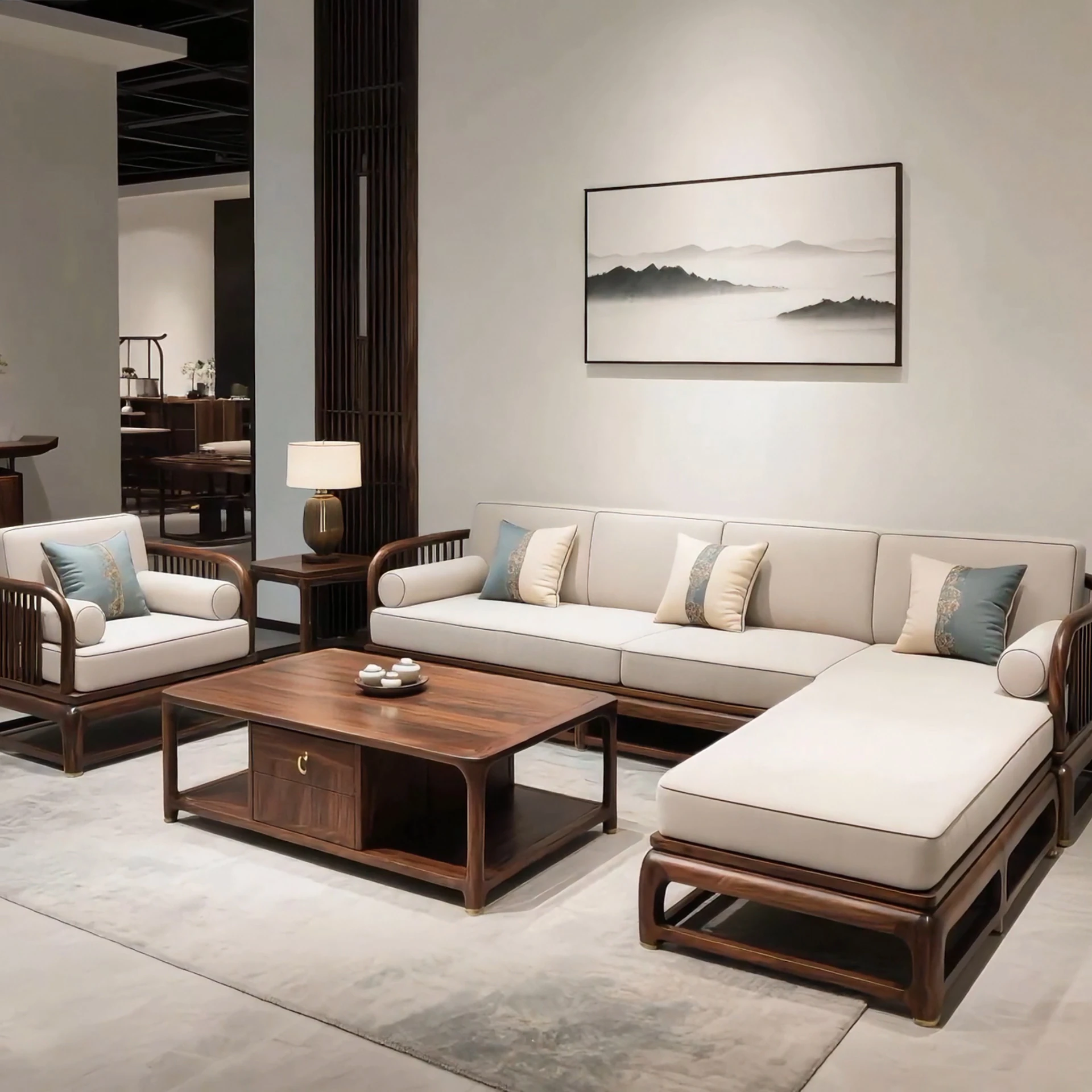 North American Black Walnut Solid Wood Corner Chaise Sofa Set - New Chinese Zen Style, Fabric Design for Small Living Rooms and Show Homes