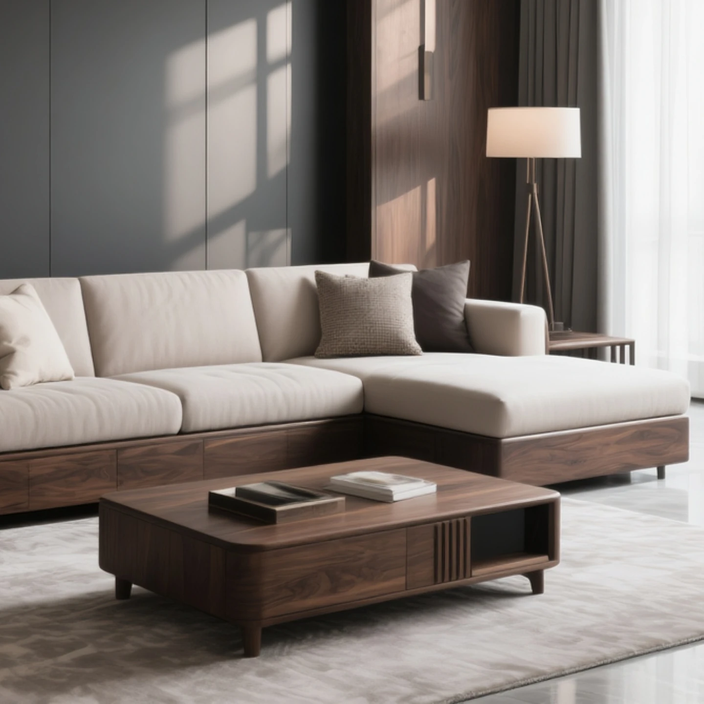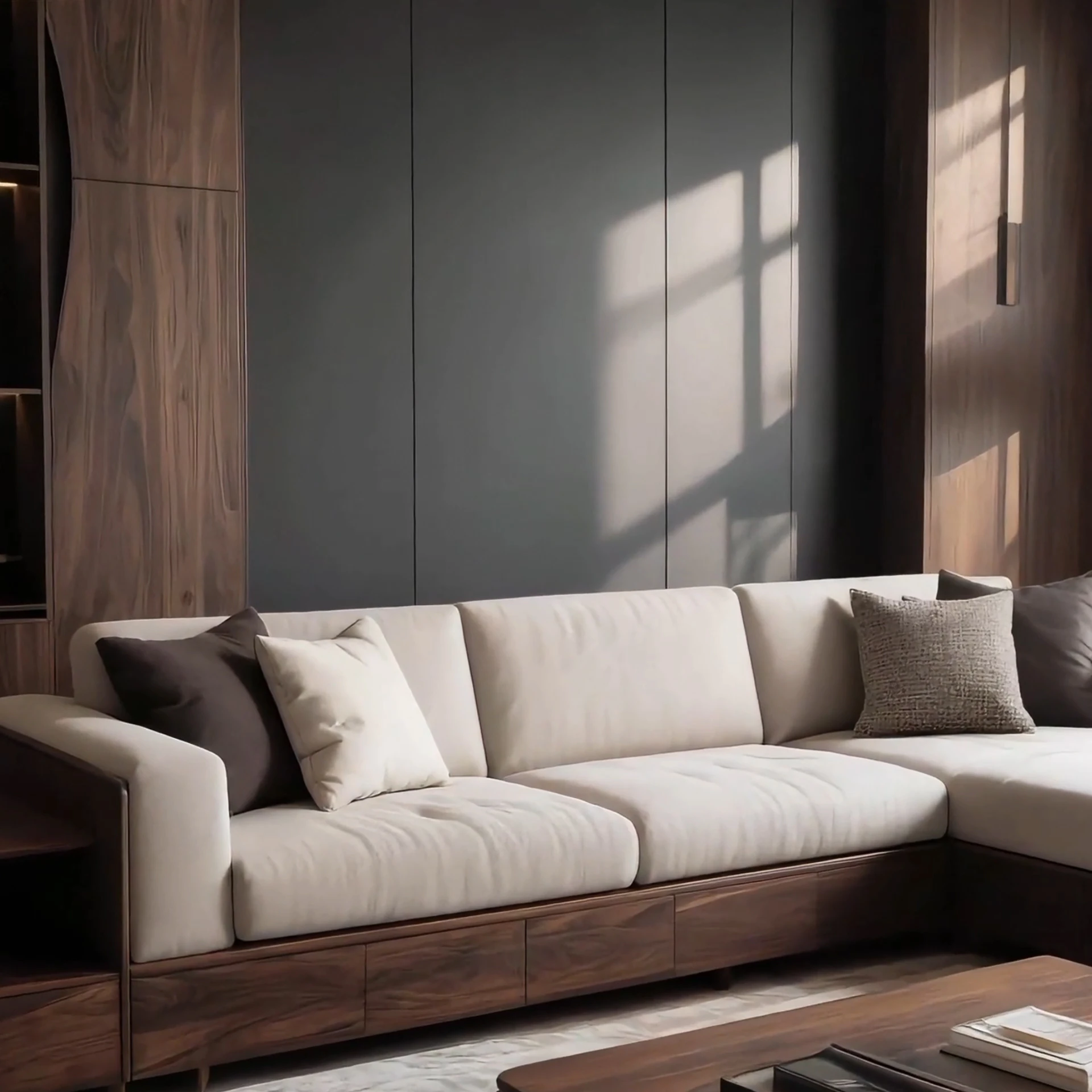 Premium North American Black Walnut Modern Minimalist Fabric Sectional Sofa – Luxurious Corner Sofa with Solid Wood Chaise for Your Living Room