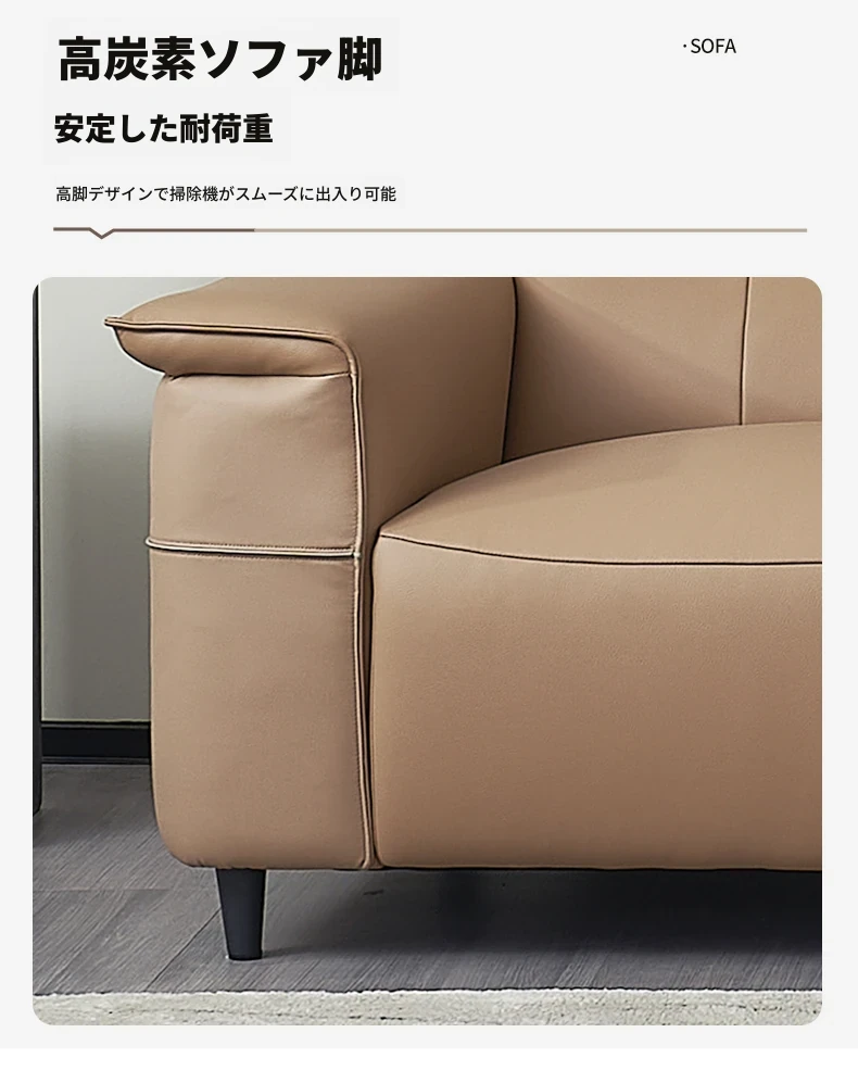 現代的ミニマリスト向け、復古風の浮遊感を持つサンドカラーソファ。小さなリビングにぴったりの直線デザイン、本革使用で上質な柔らかさを実現。あなたの空間に洗練された雰囲気をプラスします。
