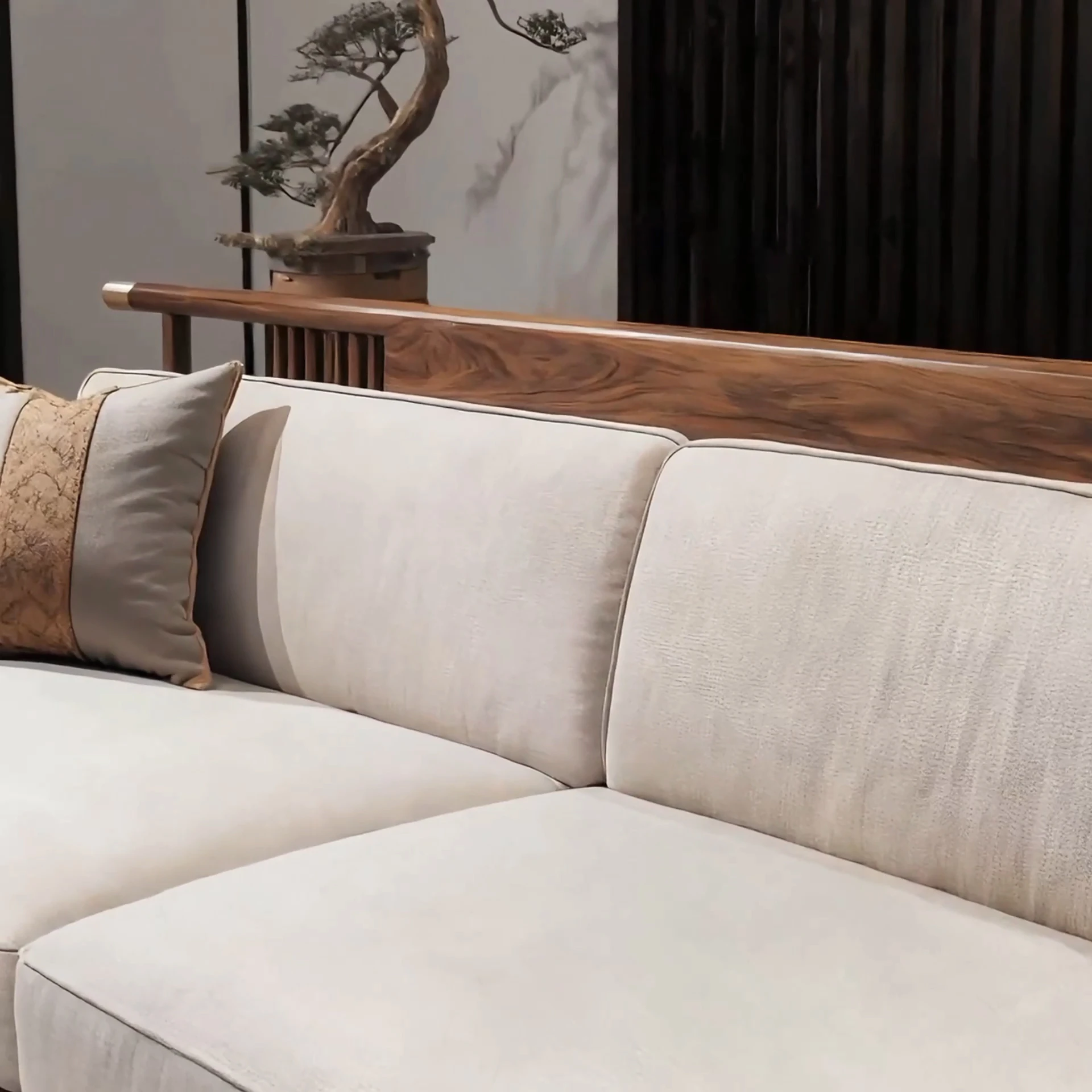 新中式デザインの実木ソファ - 2025年新作!北米産ブラックウォールナット使用の直列3人掛けソファ。優雅な宋式家具で、リビングに洗練された雰囲気をプラス!