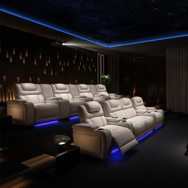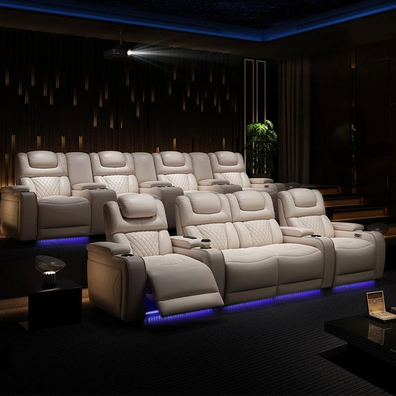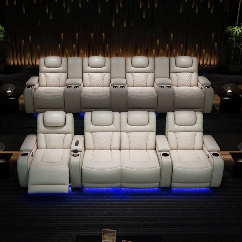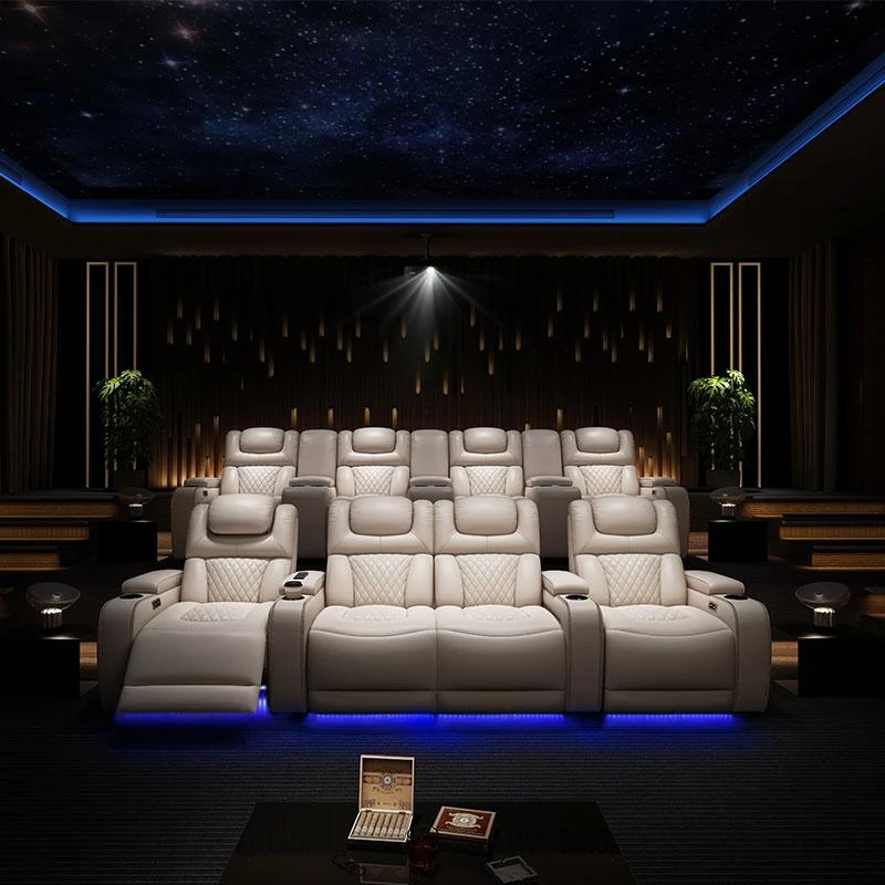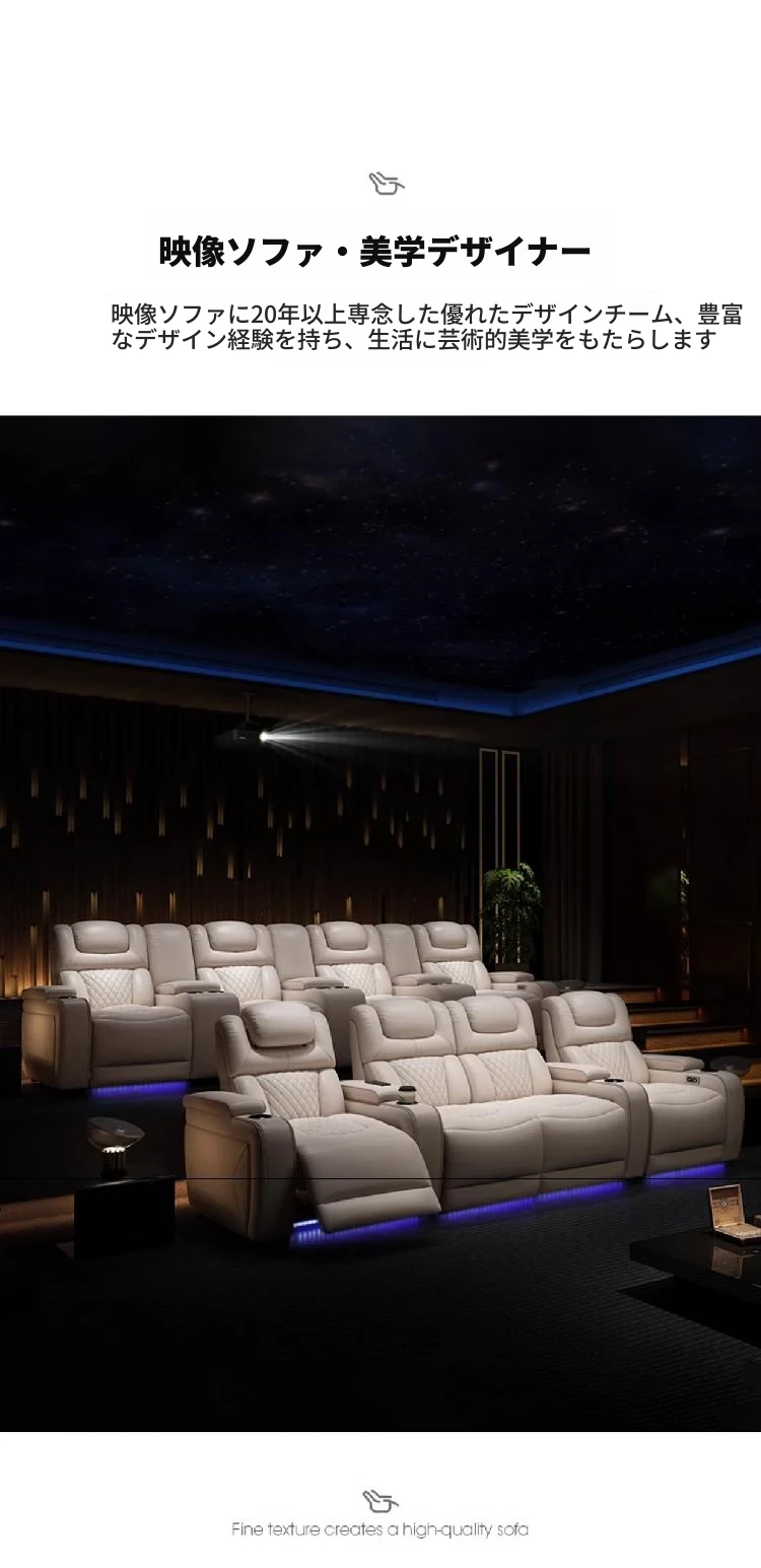2025年新作!プライベートヴィラ向け家庭シアターソファー - 電動機能付き、航空機のような快適さで映画を楽しむための特別なシート。家族や友人と最高のシアター体験を!