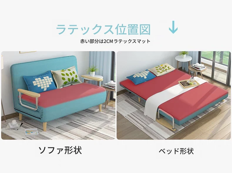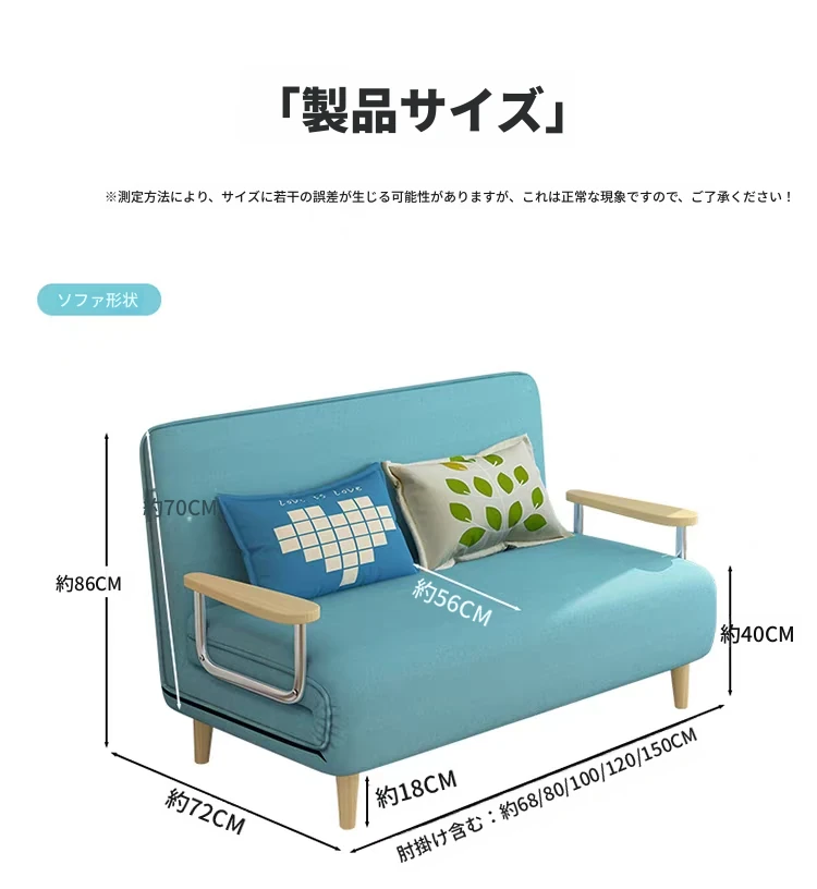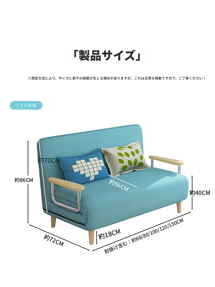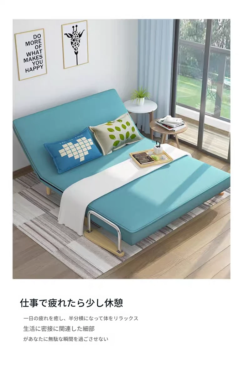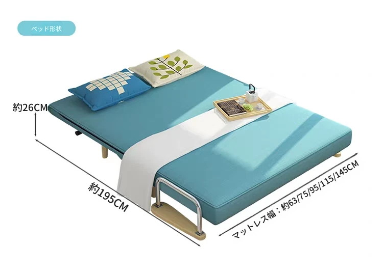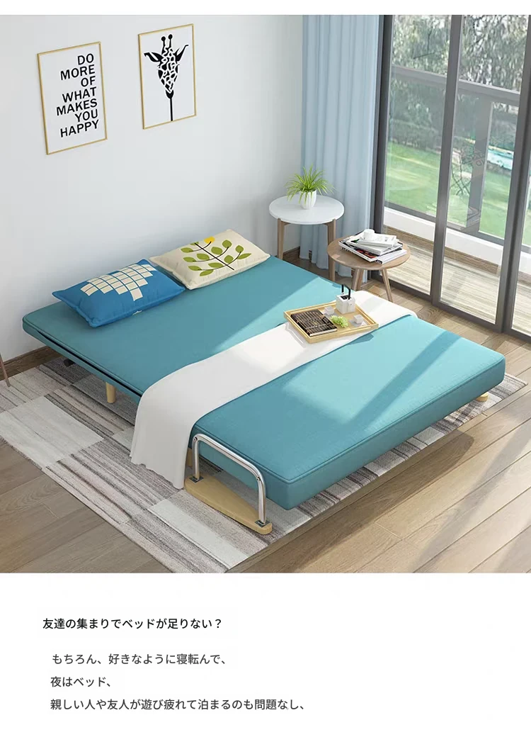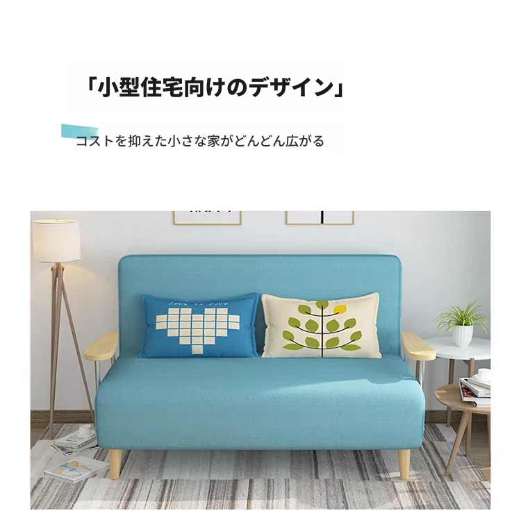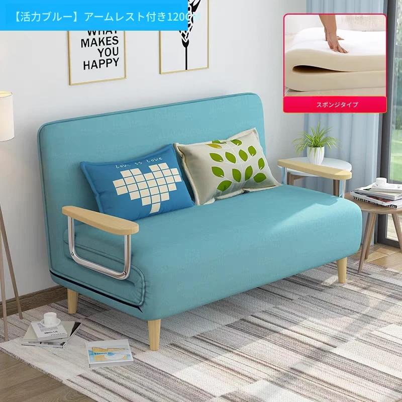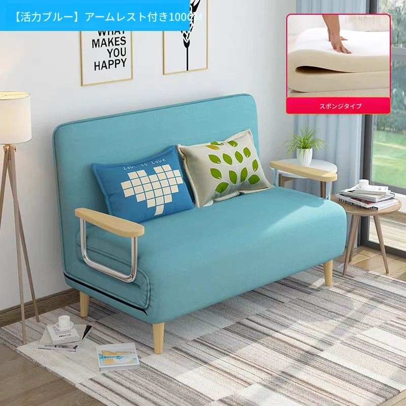 【コットンリネン100cmアクティブブルー】金属+オークアームレスト二人用ソファベッド スポンジタイプ