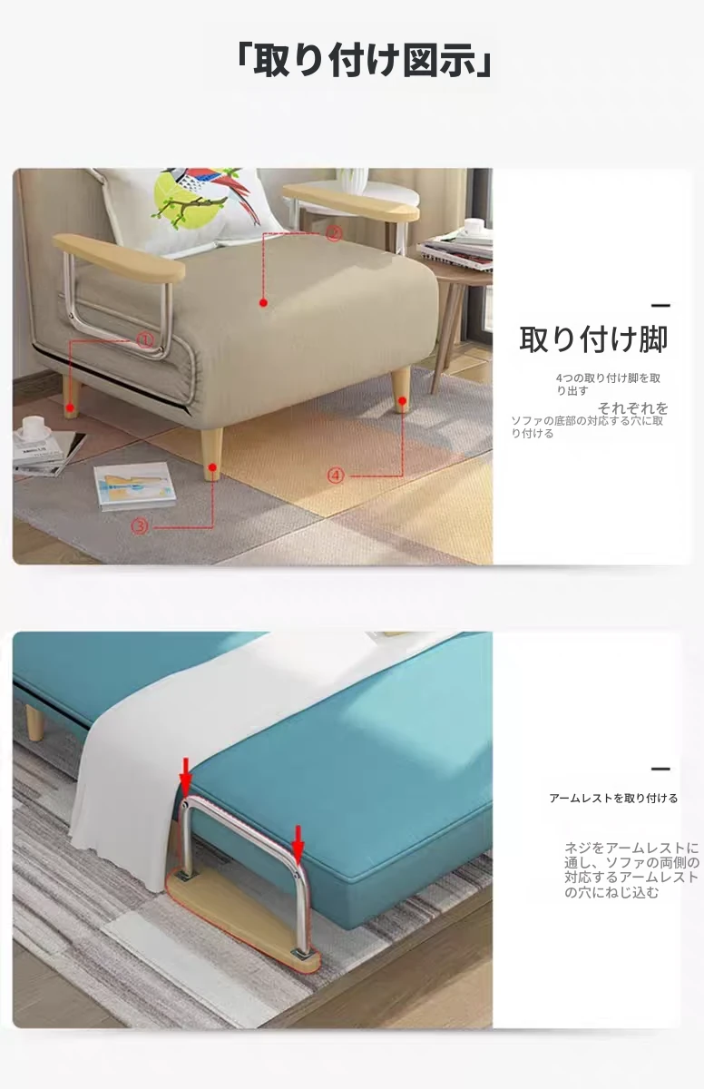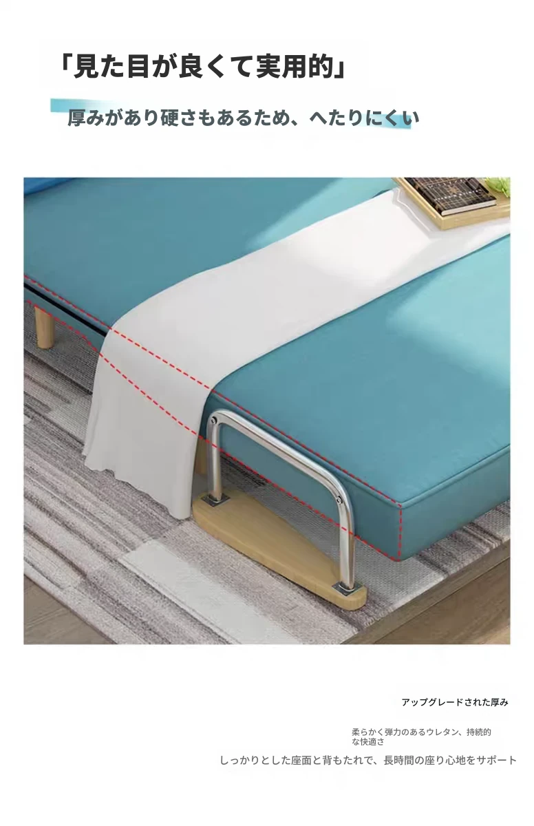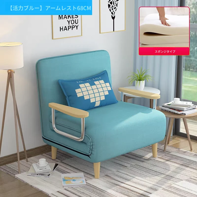 【コットンリネン68cmアクティブブルー】金属+オークアームレスト一人用ソファベッド スポンジタイプ