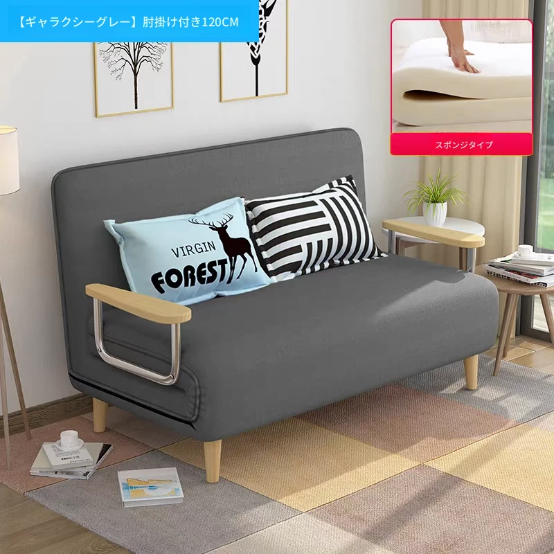 【コットンリネン120cmギャラクシーグレー】金属+オークアームレスト二人用ソファベッド スポンジタイプ