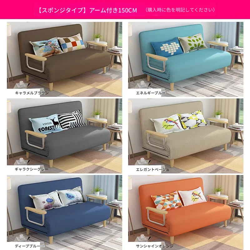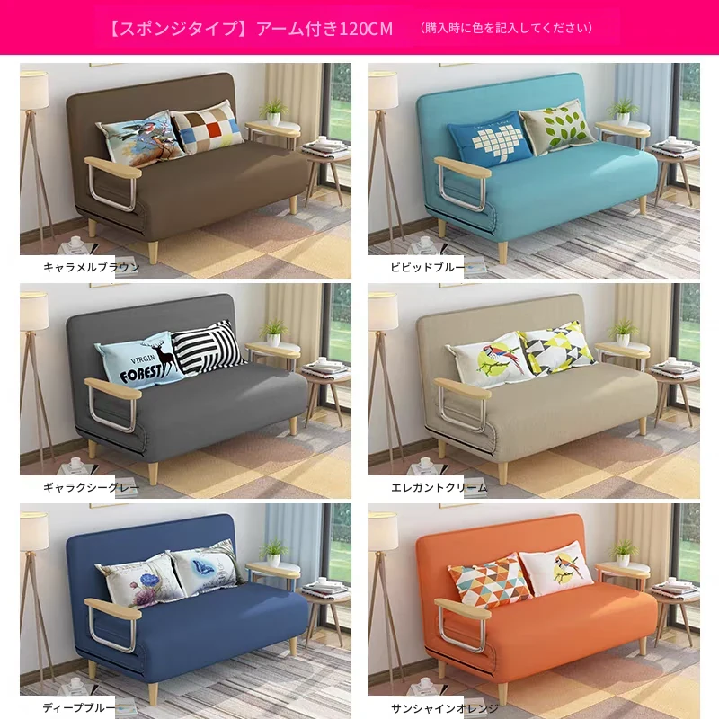 【コットンリネン120cmサンシャインオレンジ】金属+オークアームレスト二人用ソファベッド スポンジタイプ