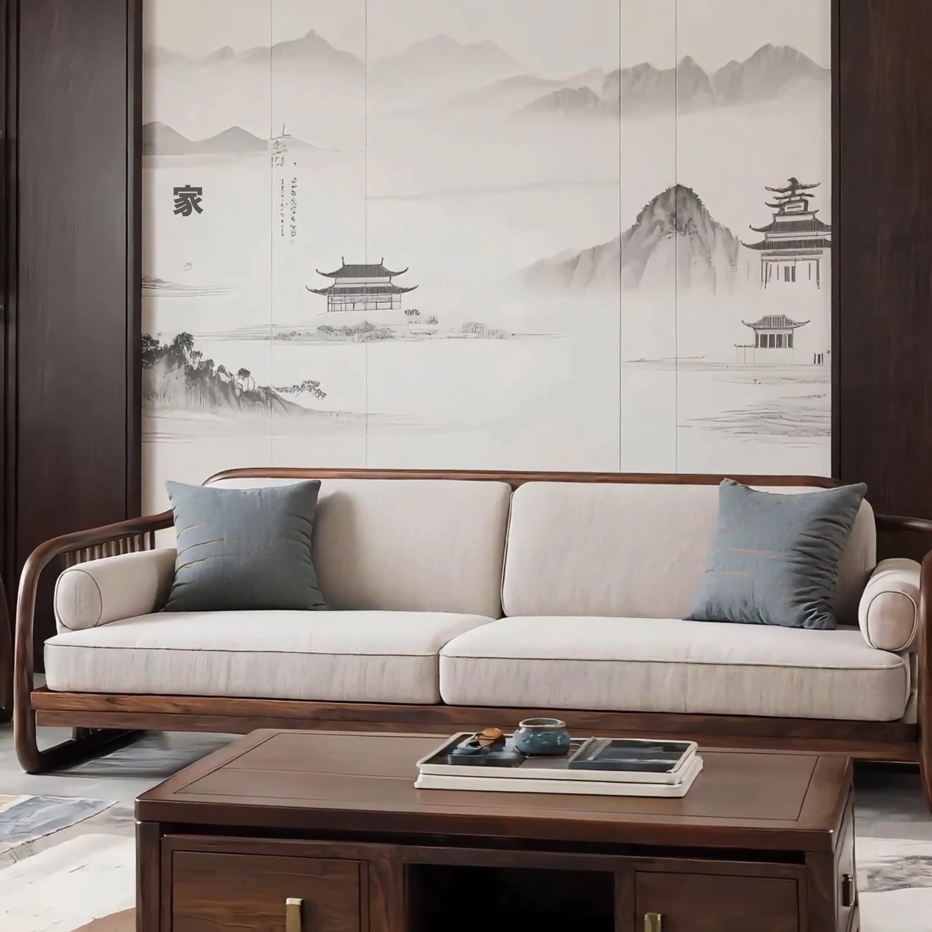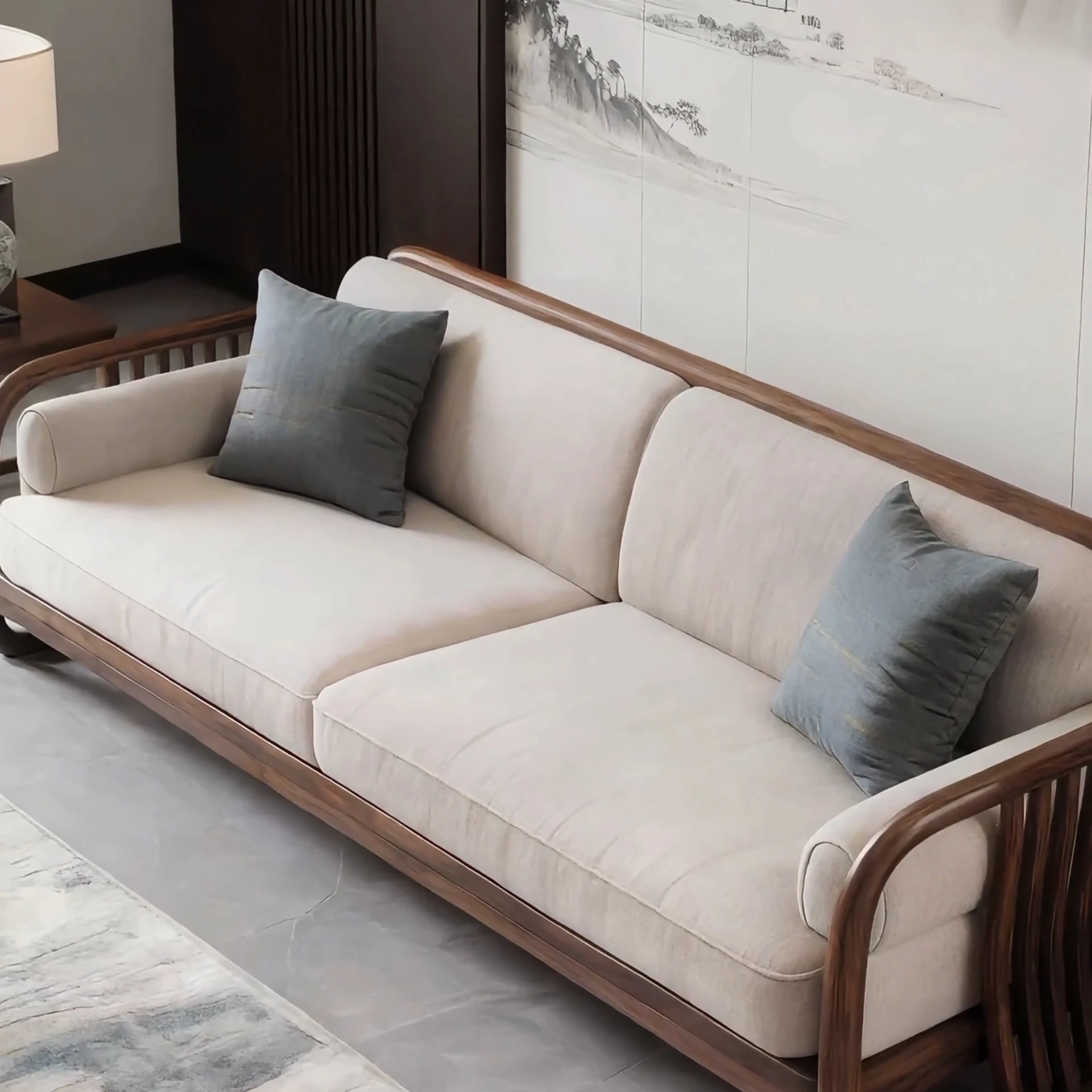 新中式スタイルの北米産ブラックウォールナットソファー - ストレートデザイン、リラックスできるホテル・民宿・オフィス用のラグジュアリー家具、モデルルームにも最適!