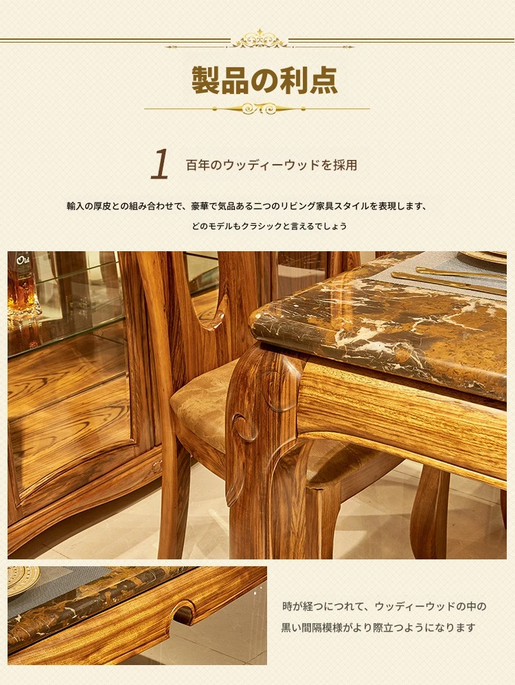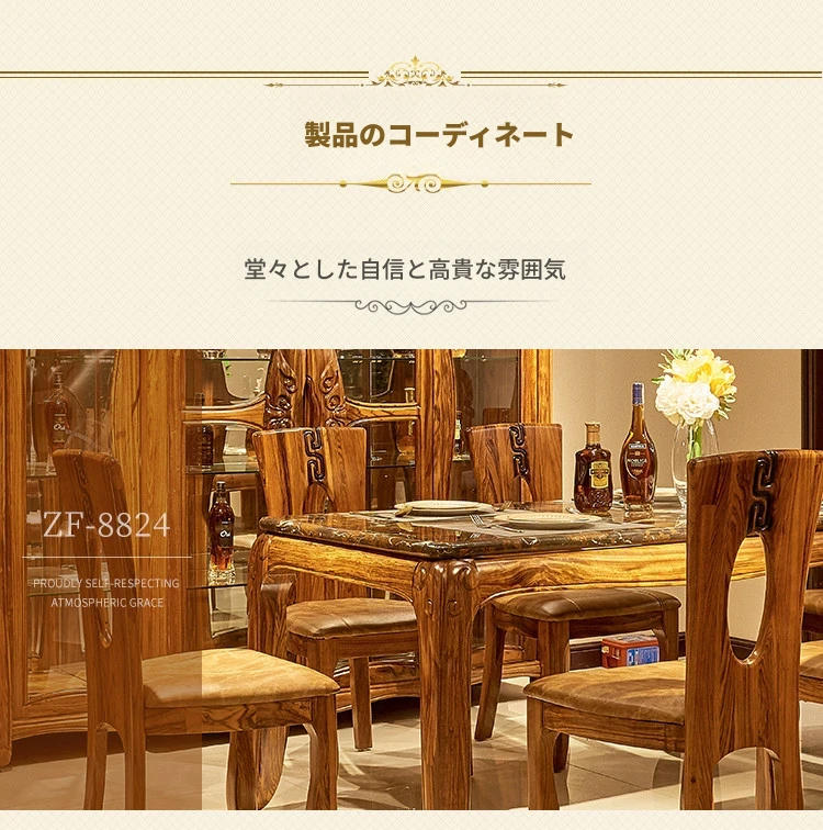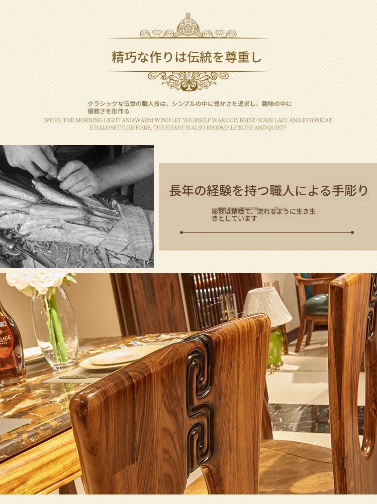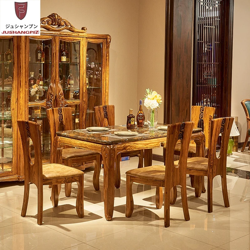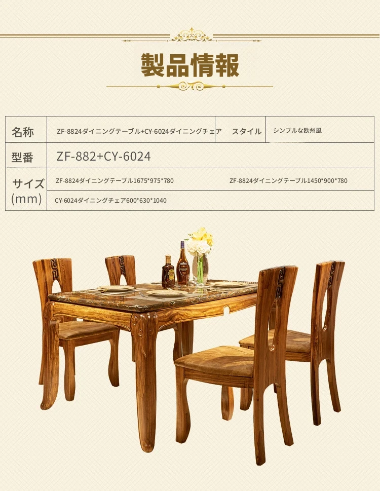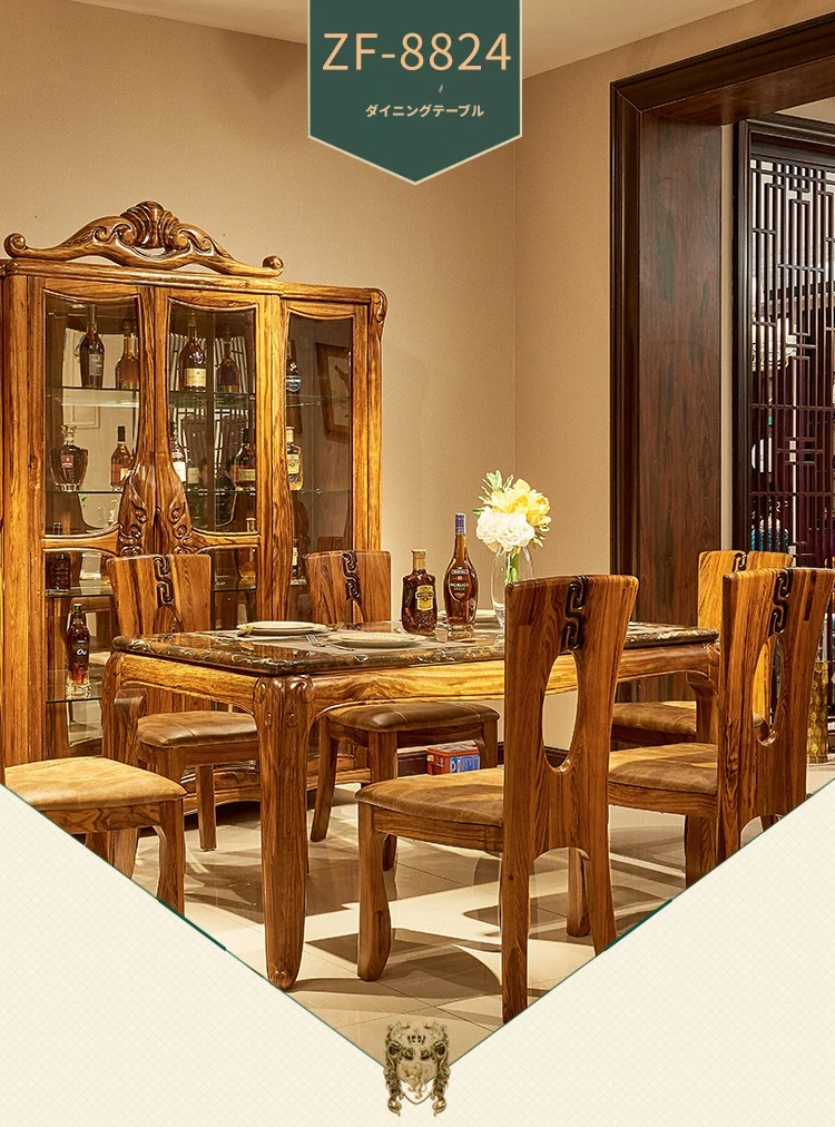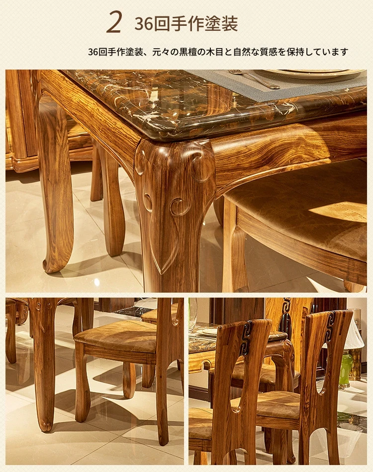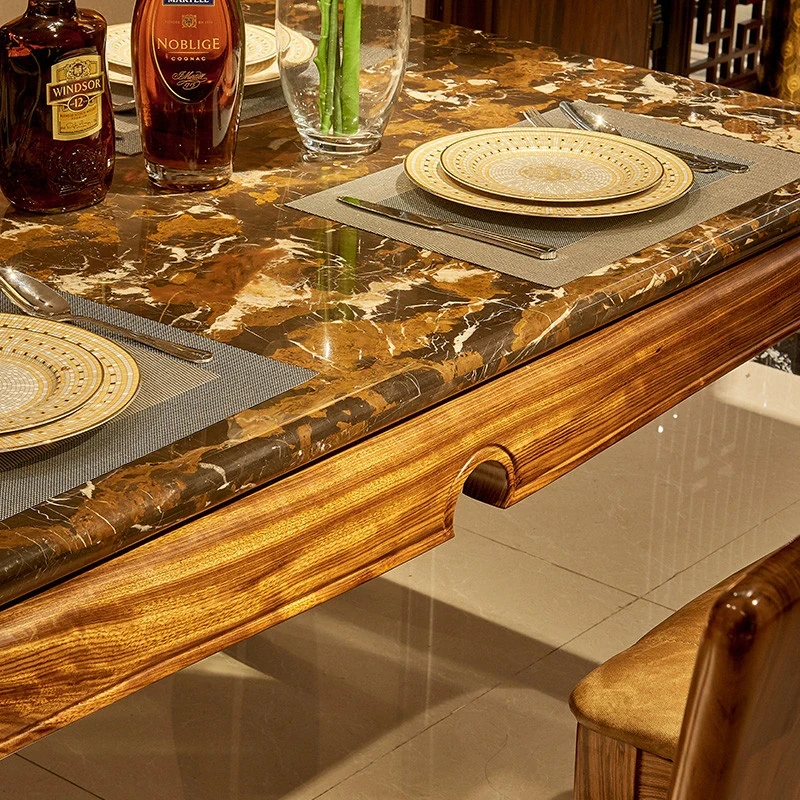 新中式デザインの実木製ダイニングテーブル - 欧風スタイルの長方形テーブル、ウッディブラックウッド使用、エレガントな大理石のテーブルとチェアセットで、上質な食事空間を演出します。