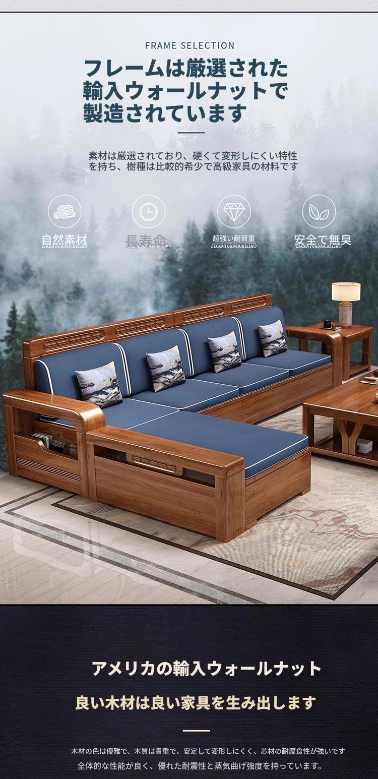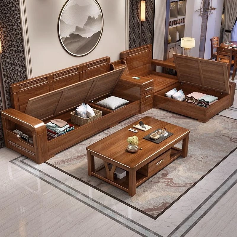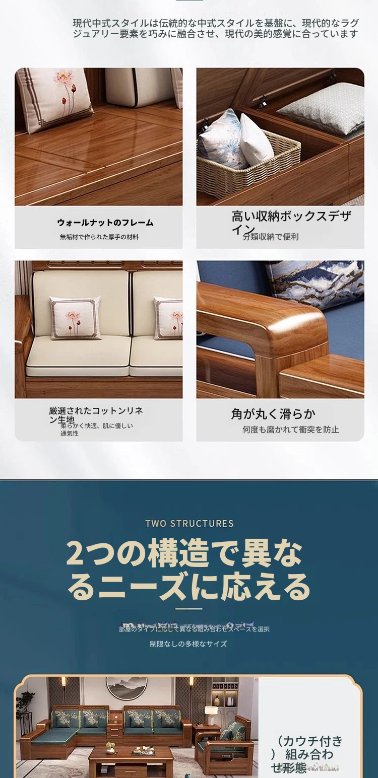【香港送料無料】中華スタイルの冬夏兼用リビング収納金色胡桃木ソファセット、角型デザインでスペースを有効活用!高品質な布張り、心地よい座り心地を実現。おしゃれで機能的なインテリアをお楽しみください!