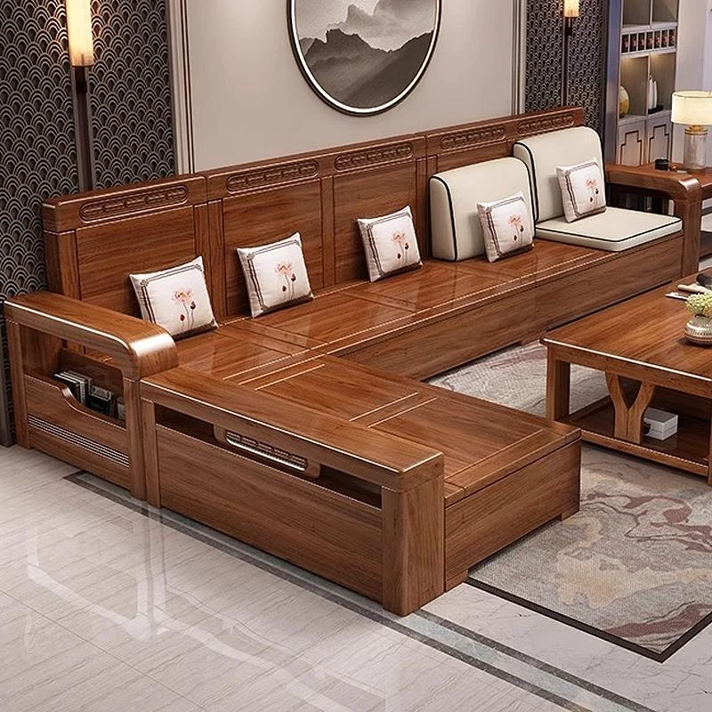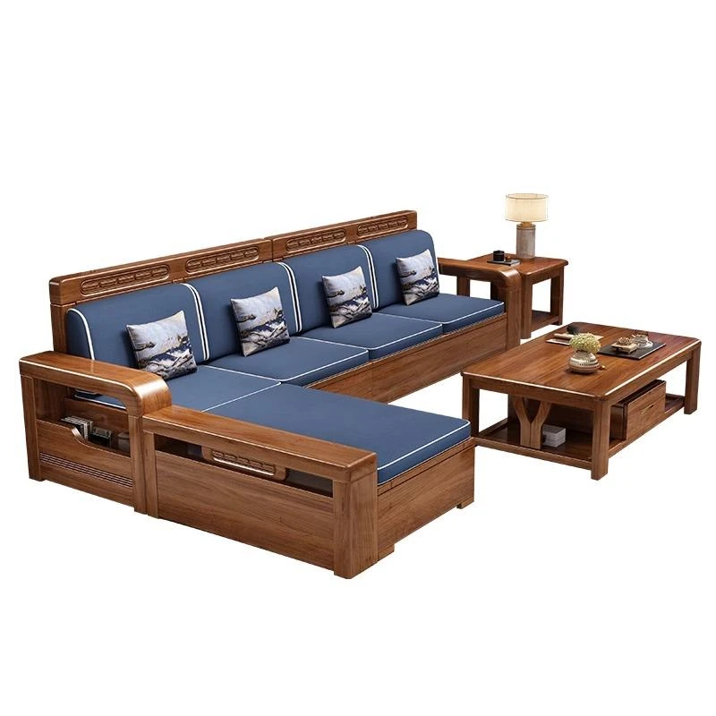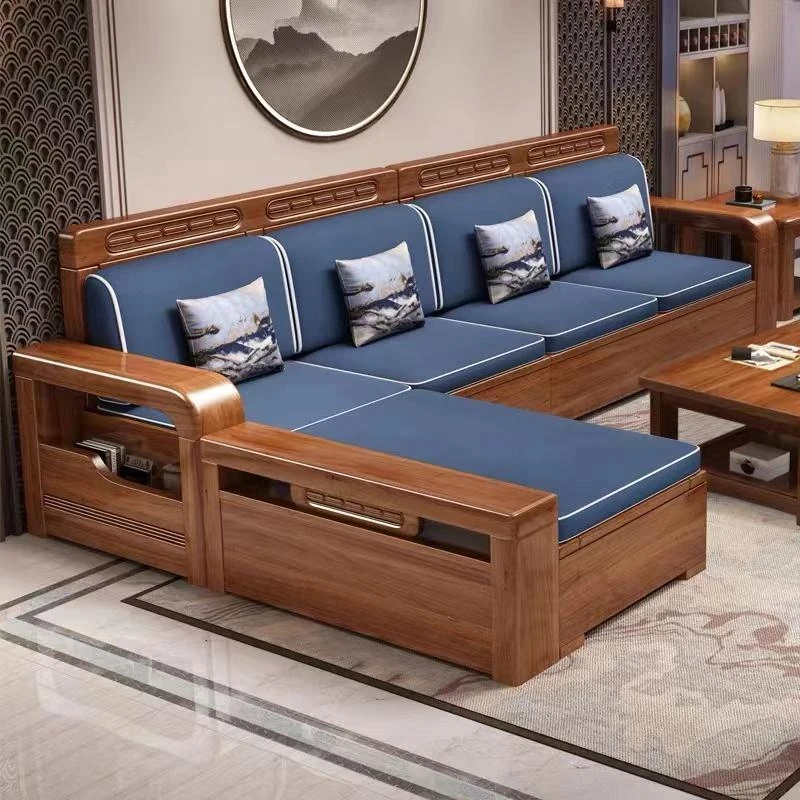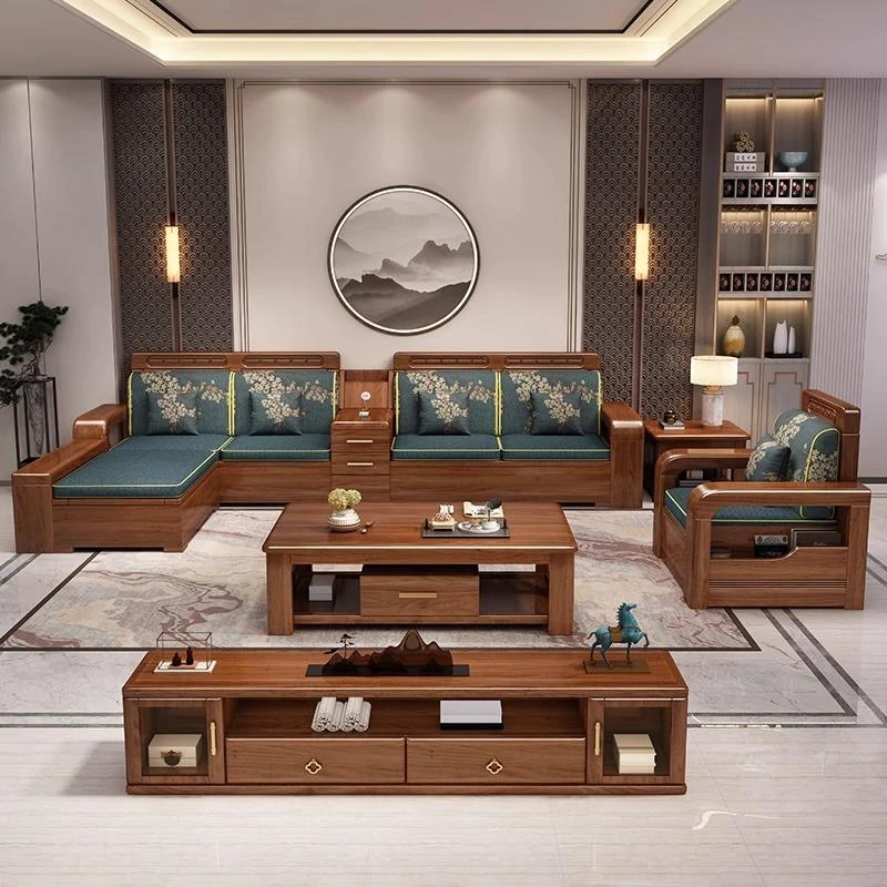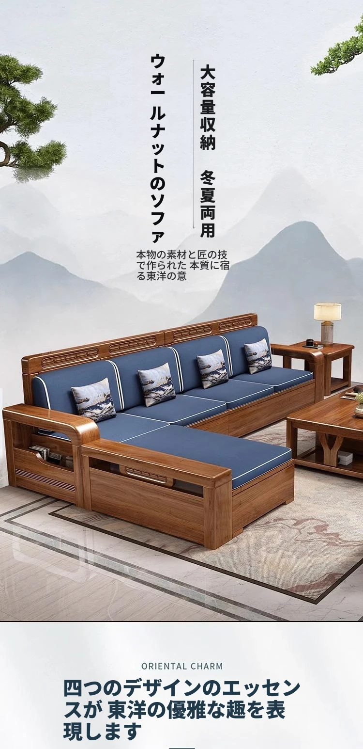 【香港送料無料】中華スタイルの冬夏兼用リビング収納金色胡桃木ソファセット、角型デザインでスペースを有効活用!高品質な布張り、心地よい座り心地を実現。おしゃれで機能的なインテリアをお楽しみください!