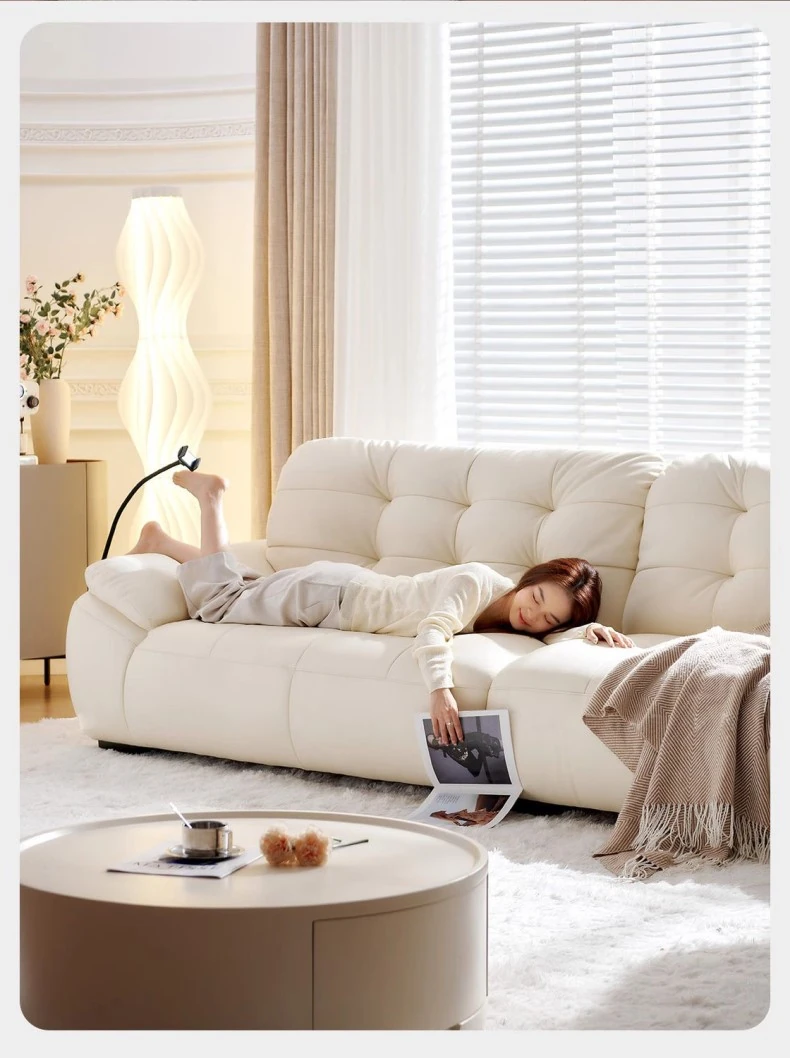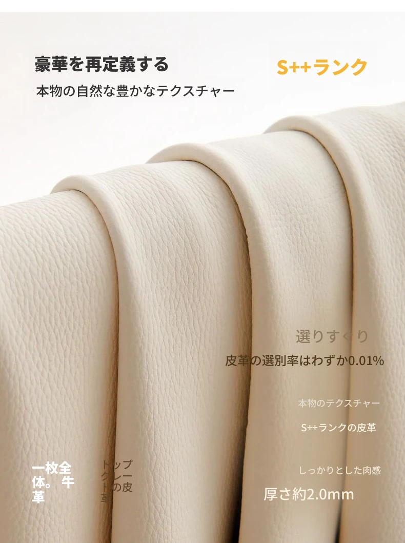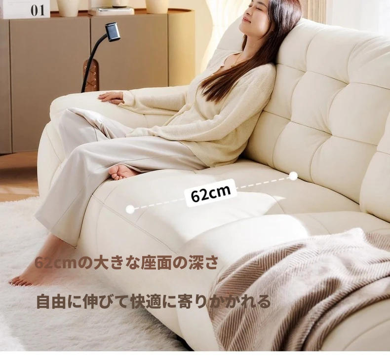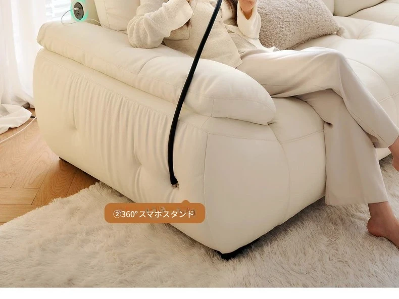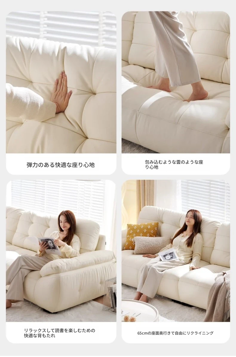 フレンチクリーム風の本革ソファ、小型リビングに最適!ふわふわのマシュマロソファは、充電機能付きで多機能。可愛らしい帆船と雲のデザインで、あなたの空間をおしゃれに彩ります。