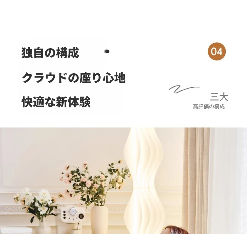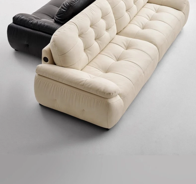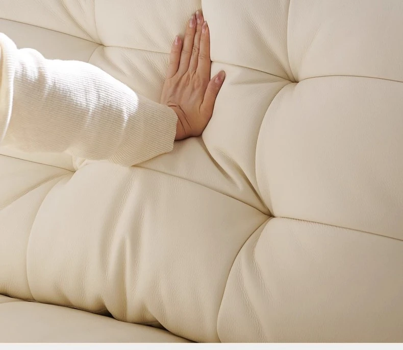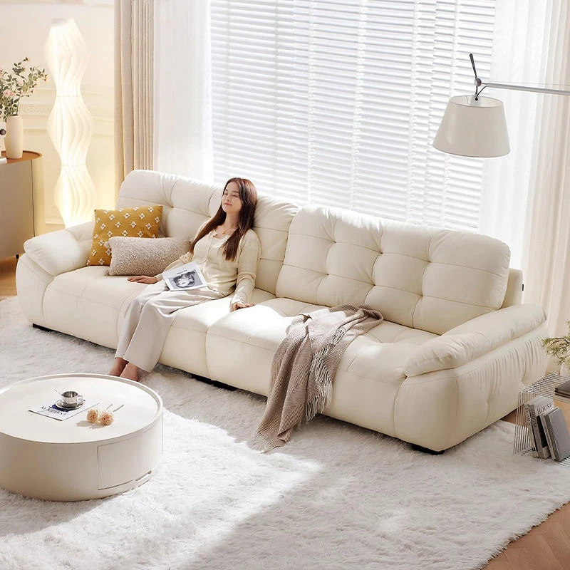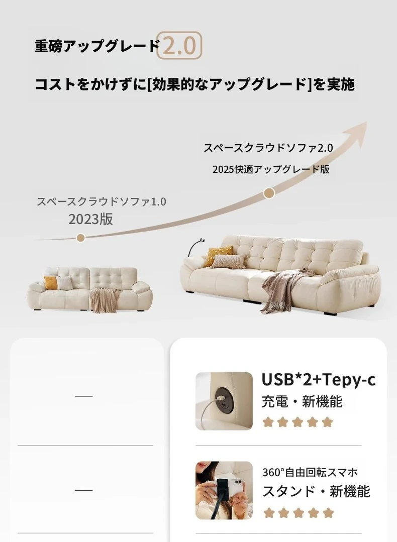 フレンチクリーム風の本革ソファ、小型リビングに最適!ふわふわのマシュマロソファは、充電機能付きで多機能。可愛らしい帆船と雲のデザインで、あなたの空間をおしゃれに彩ります。