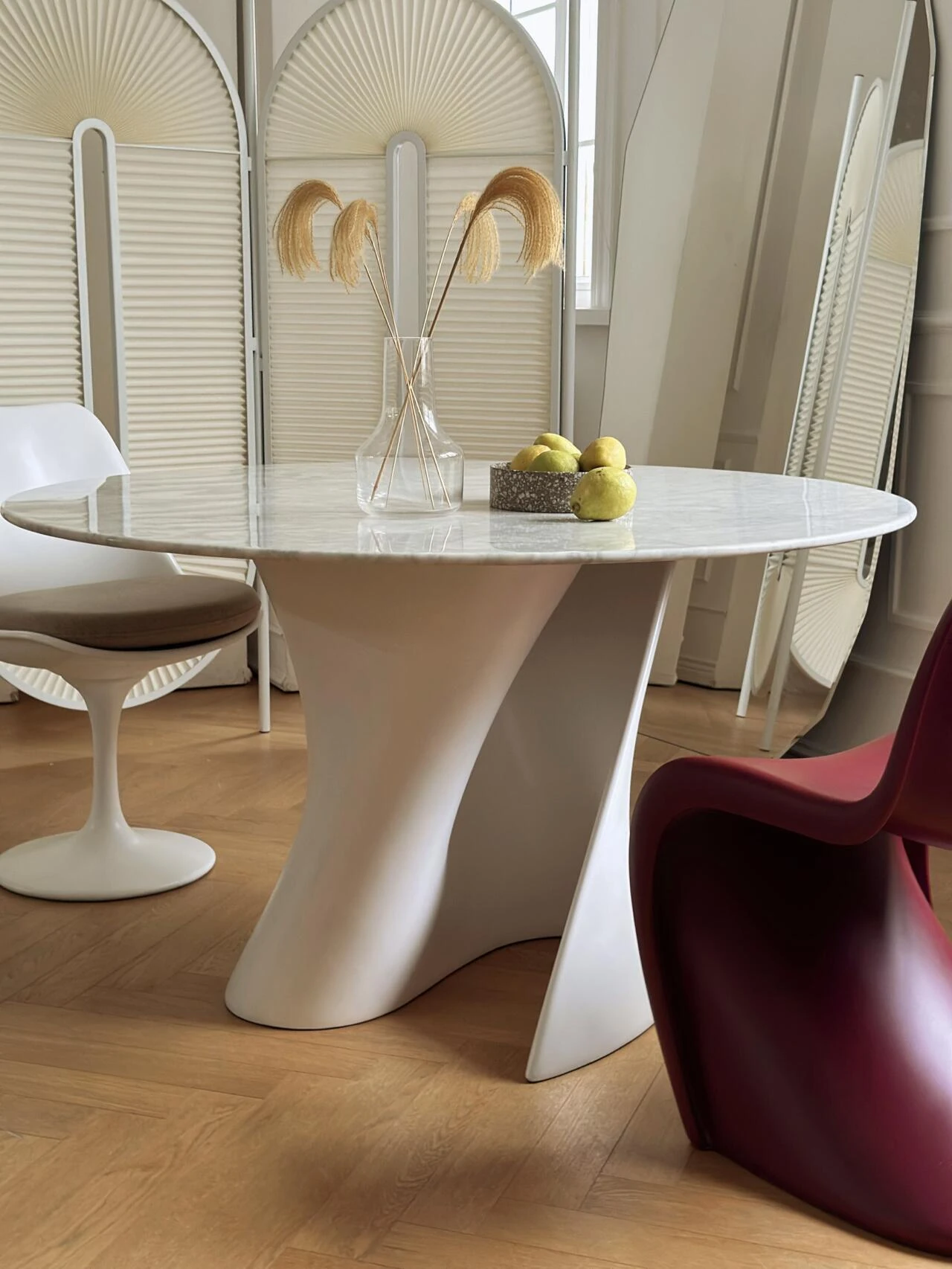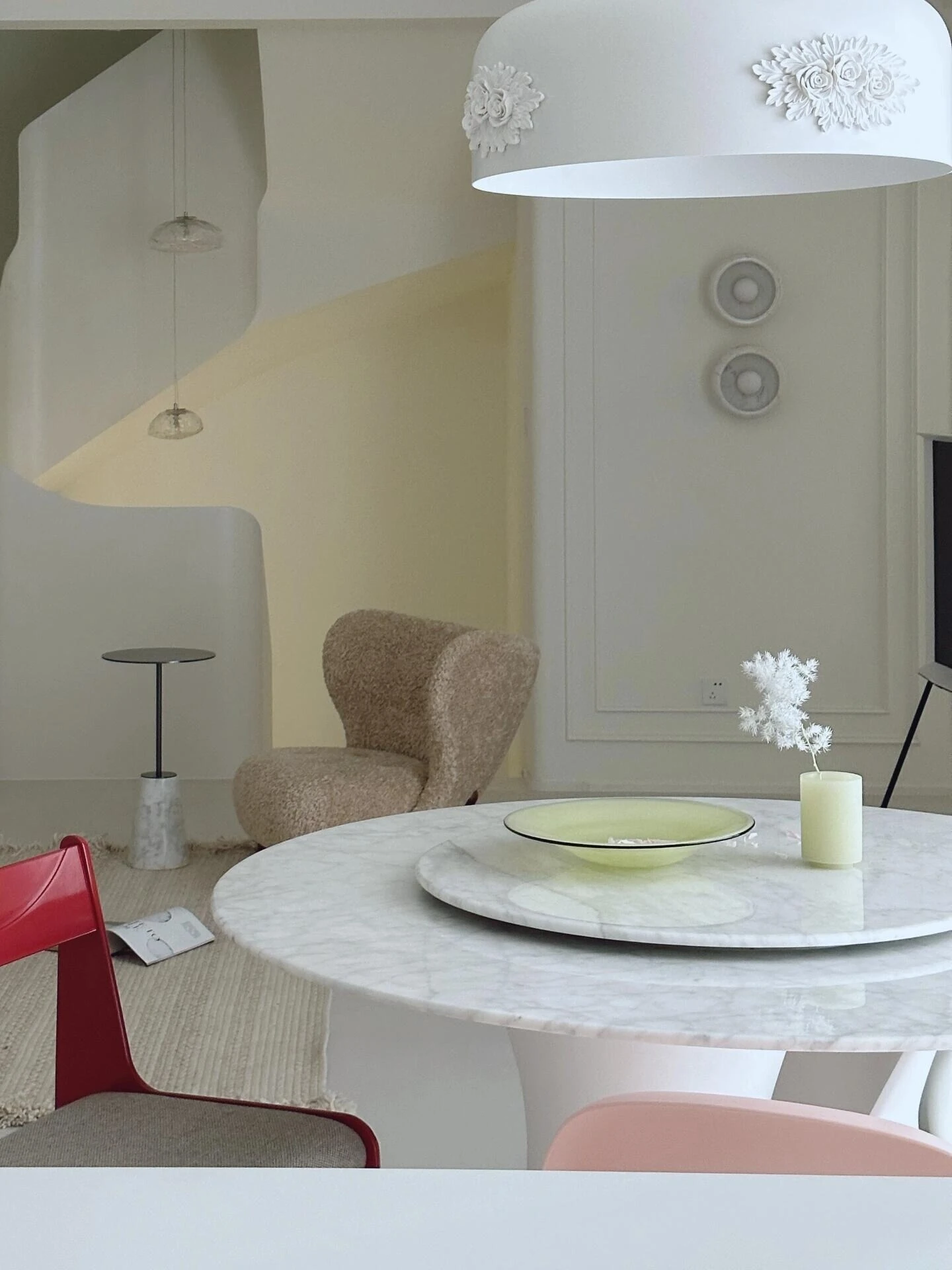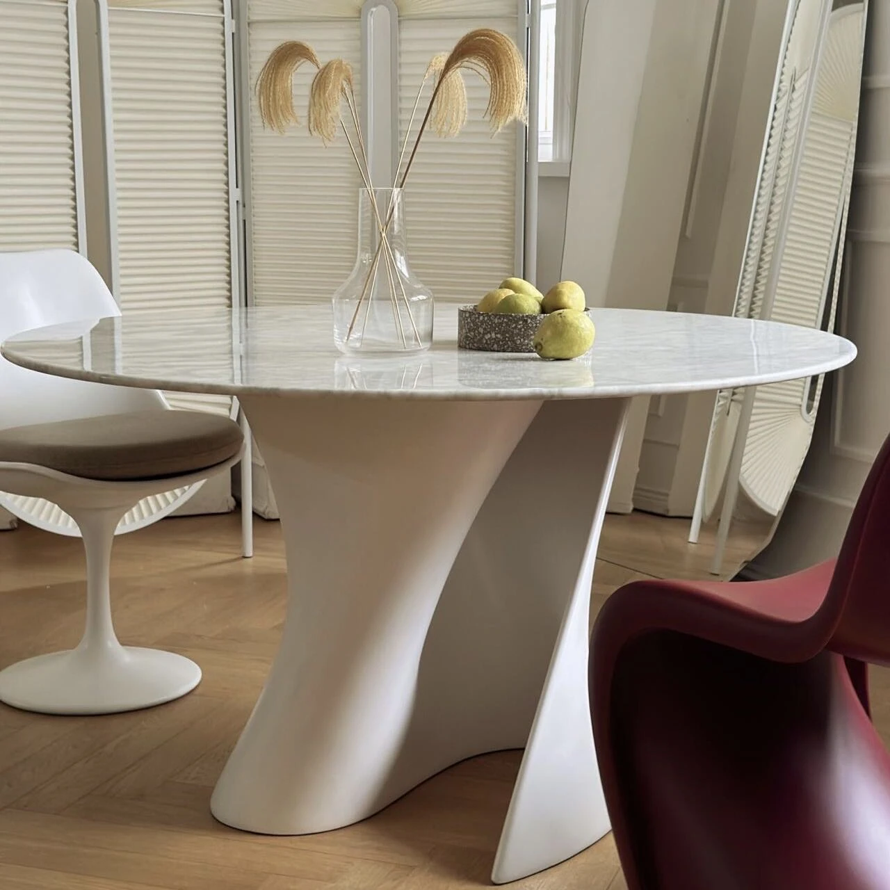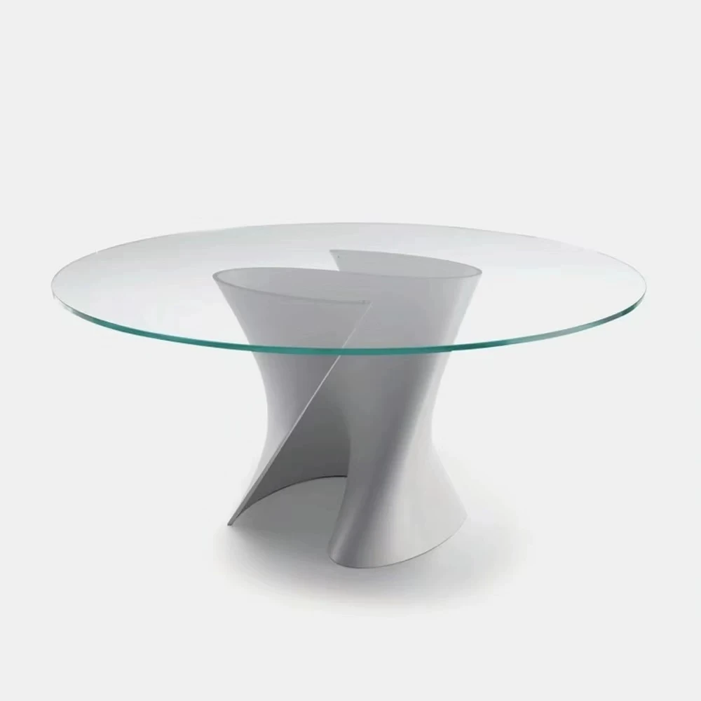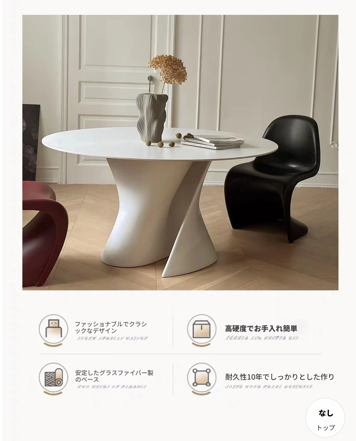 フランス風の侘び寂び大理石ダイニングテーブル、クリーム色の天然アートデザイン、ユニークな形状の回転式テーブル。自宅での談笑や食事を特別なひとときに変える、あなたのインテリアにぴったりのアイテム!