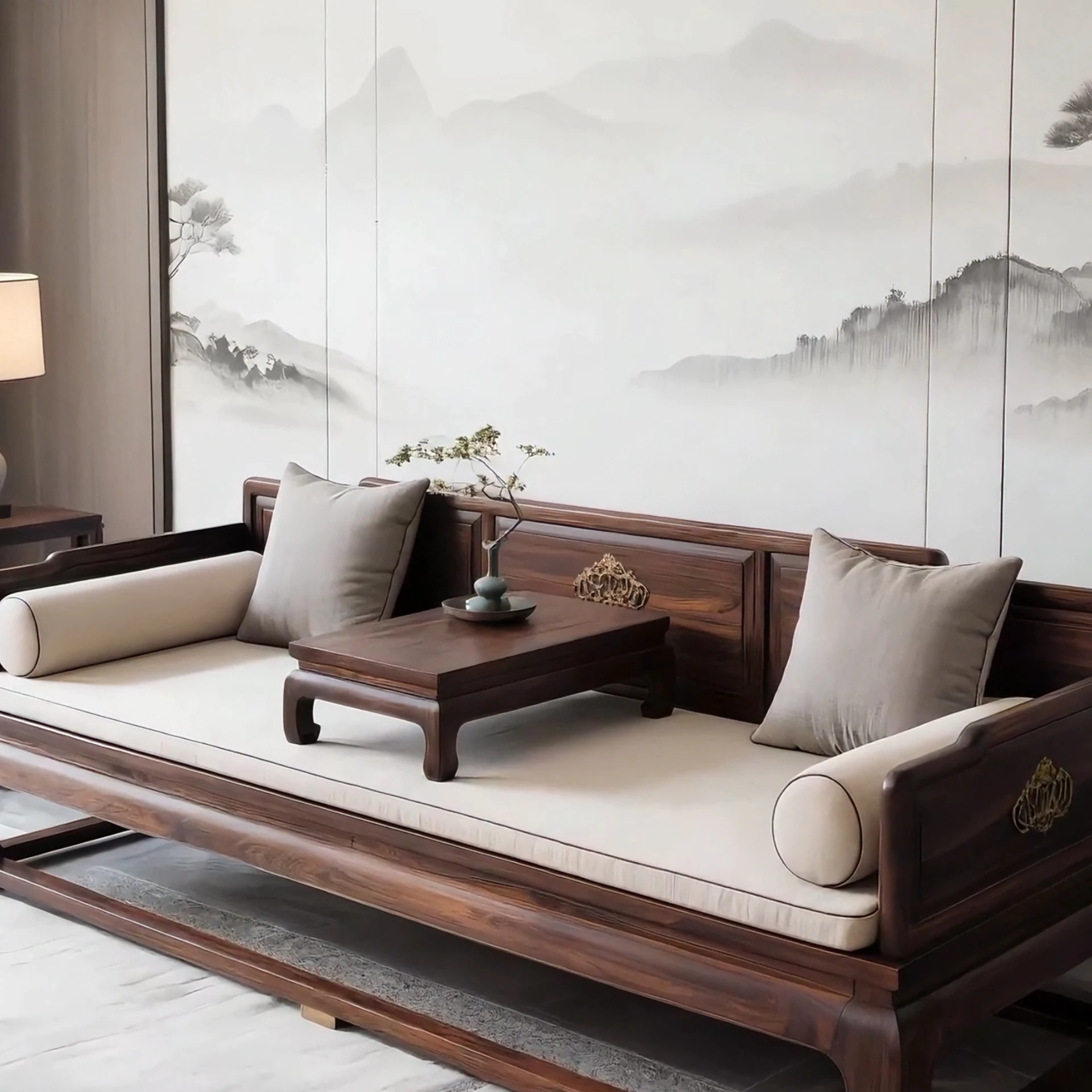 高級北米ブラックウォールナット製新中式実木ローハンベッド - 小型住宅に最適!リビングルームにぴったりのスタイリッシュなソファとしても使える、心地よい空間を演出します。