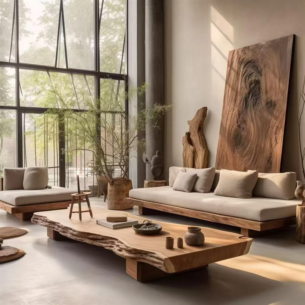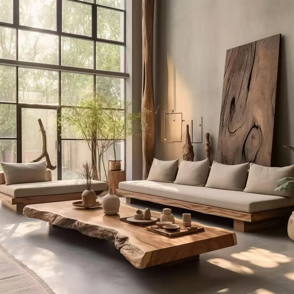 侘寂風の無垢材ソファとテーブルセット|リビングにぴったりなL字型デザイン|ホテル・別荘・モデルルーム・民宿に最適な高級家具