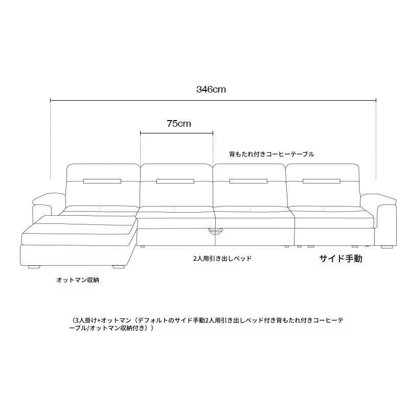 コーナー3.46メートル:側面手動+ラ床 妃ベッド収納付き
