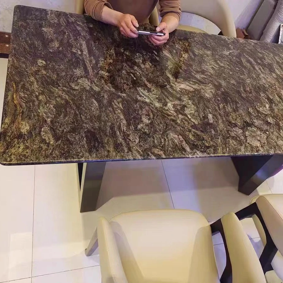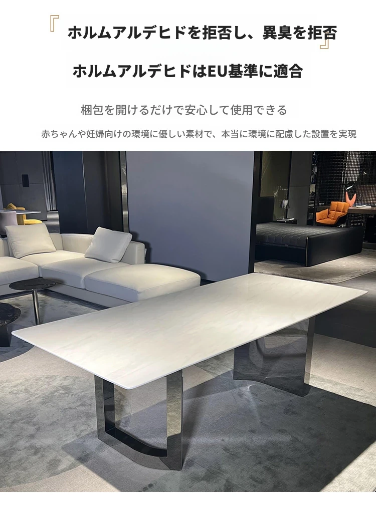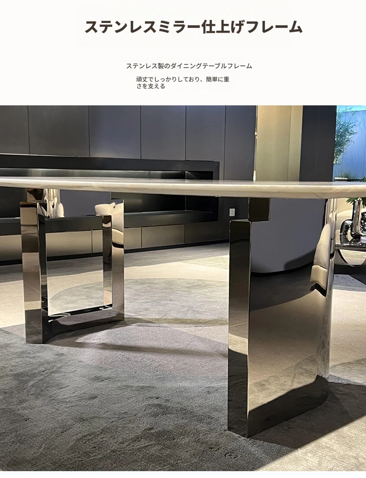 中古風の岩板ダイニングテーブル - モダン&シンプル!小型住宅にぴったりのステンレス脚付き、長方形デザイン。食事を楽しむためのテーブルと椅子のセットで、スタイリッシュな空間を演出します。