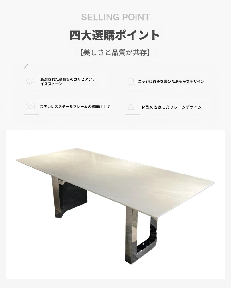 現代的ミニマリスト風ダイニングテーブル|カリブのアイスストーン大理石使用|高級感漂うヴィラスタイル|シンプルでエレガントなダイニングチェア付き|家庭用に最適なスタイリッシュテーブル