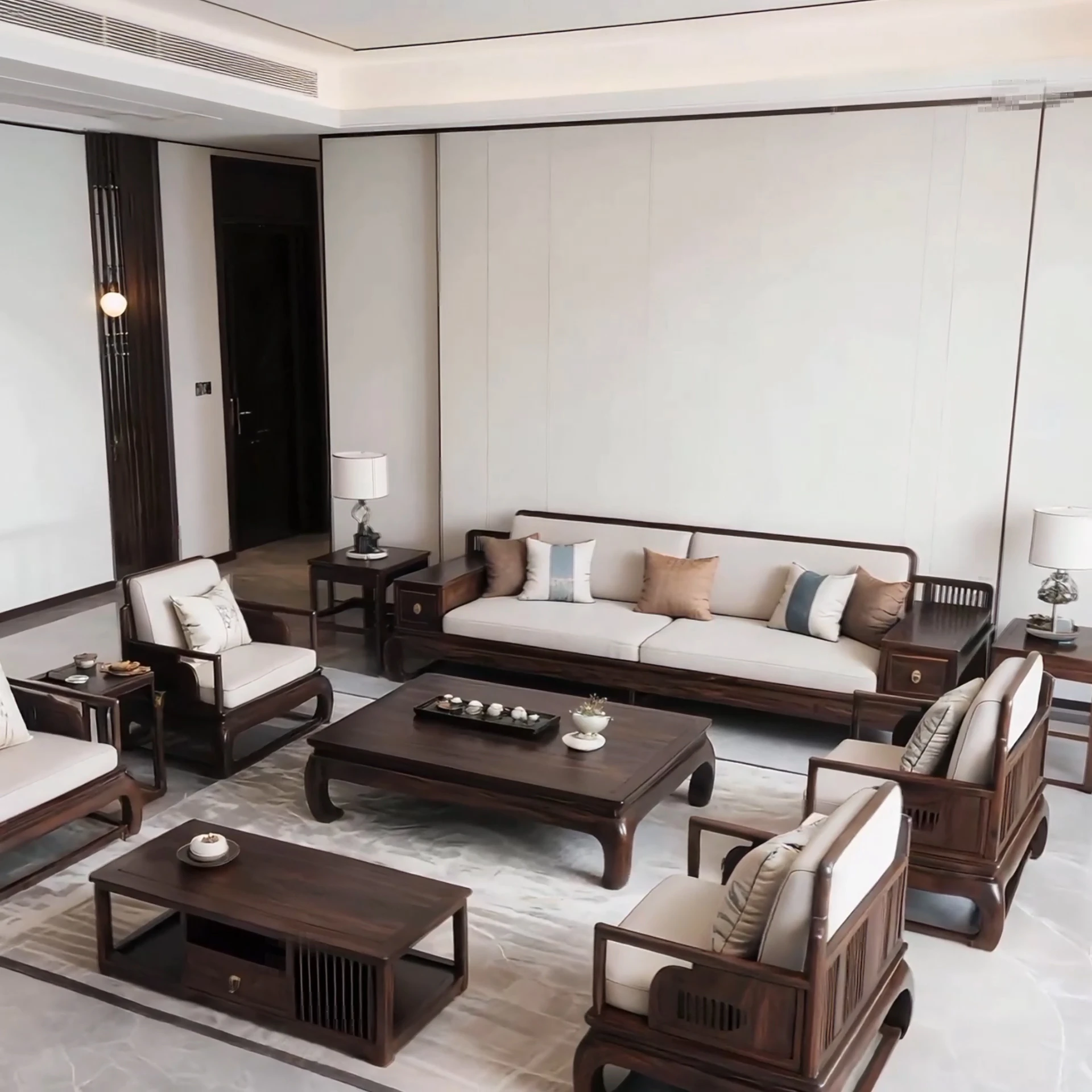 新中式スタイルの北米産ブラックウォールナット無垢材ロハンベッドソファ・コーヒーテーブルセット|宋氏別荘モデルルームのための洗練されたデザイン