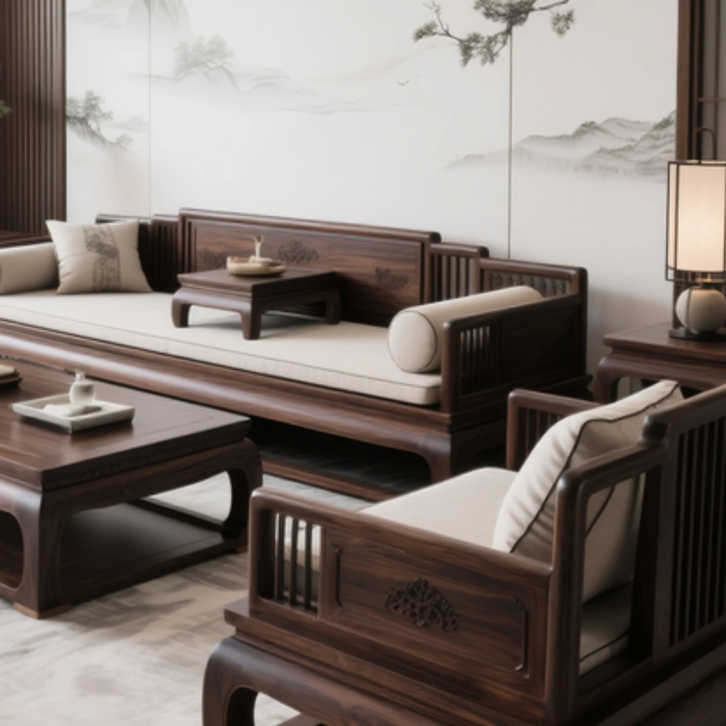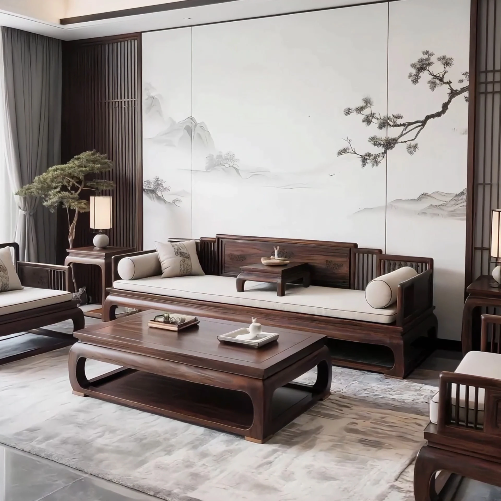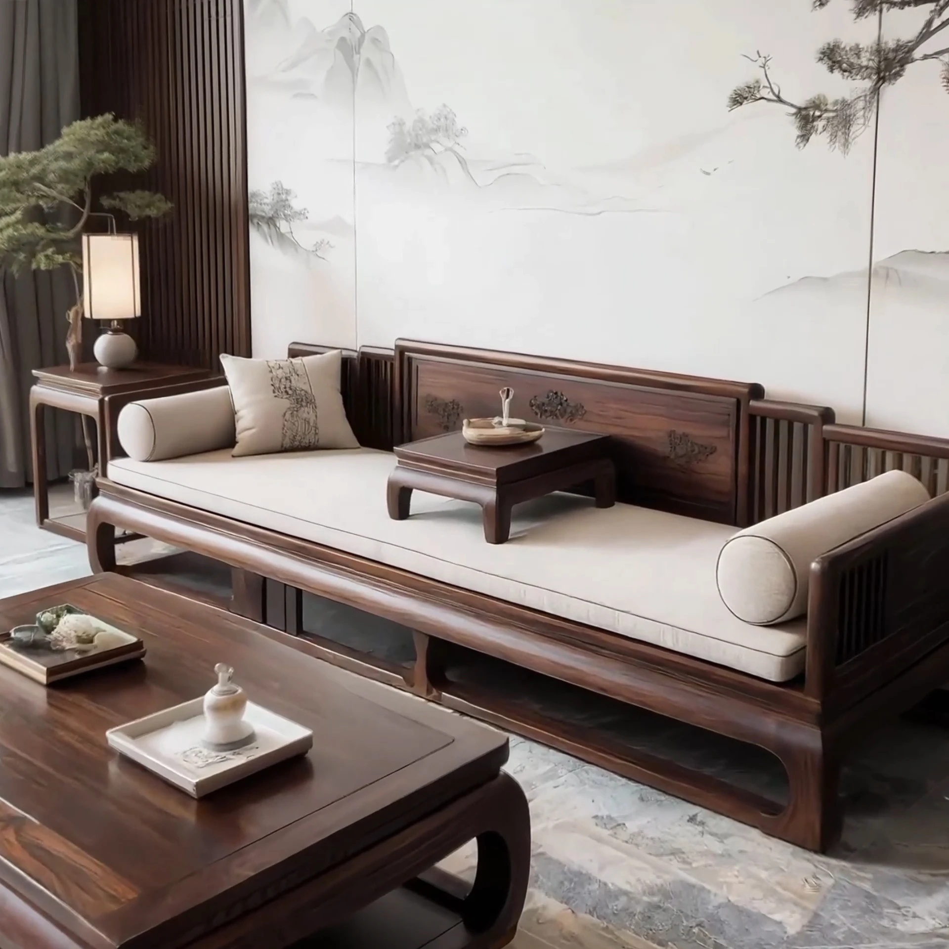 新中式デザインのローハンソファベッド&テーブルセット - 北米産ブラックウォールナット無垢材使用。おしゃれなモデルルームや民宿に最適な家具で、上質な空間を演出します。