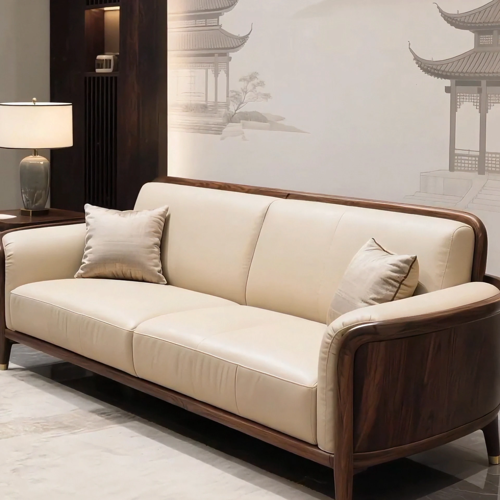 新中式スタイルの本革ソファ|高級感あふれる北米産ブラックウォールナット使用|リビングやオフィスに最適な接待用サンプル家具|贅沢な居心地をあなたの空間に!