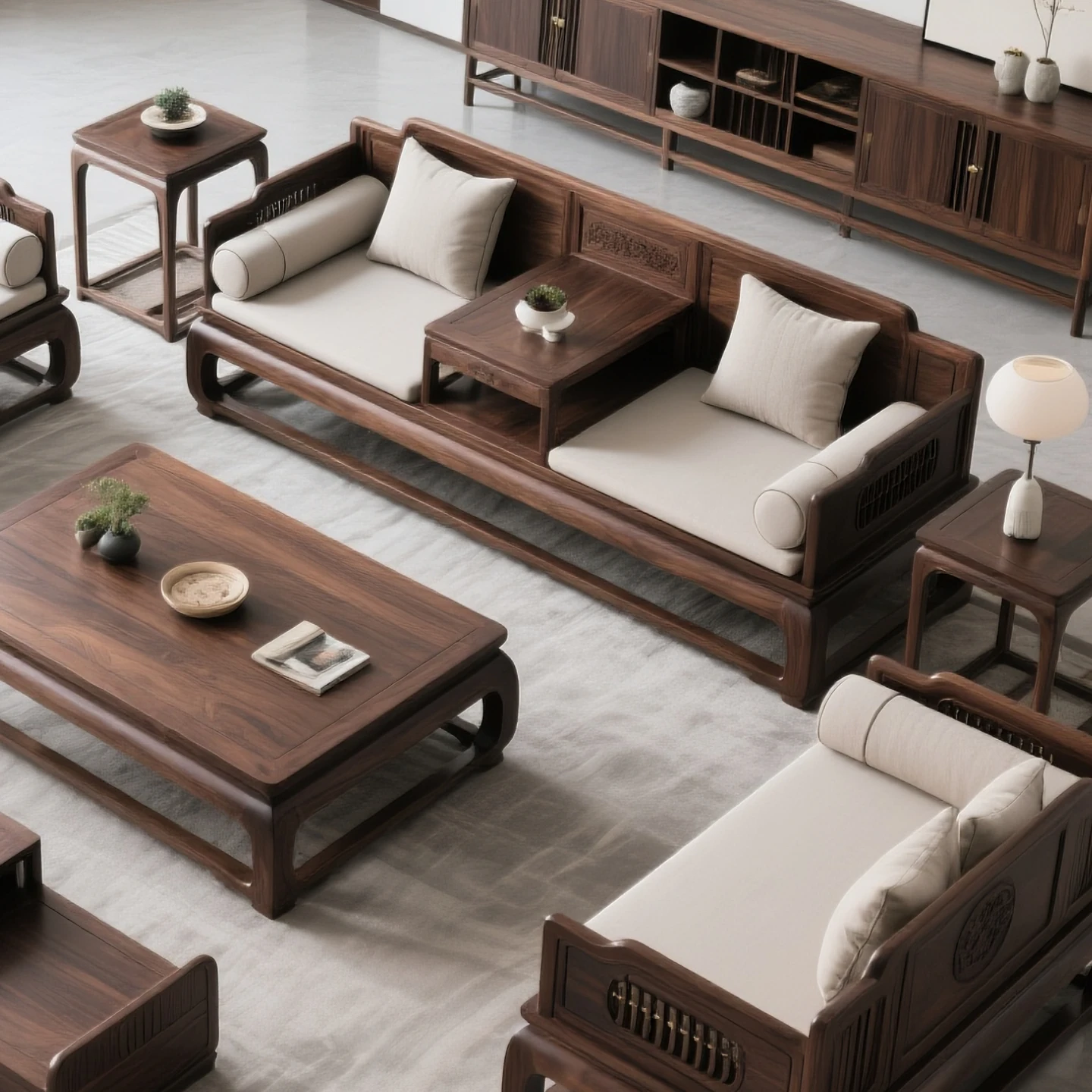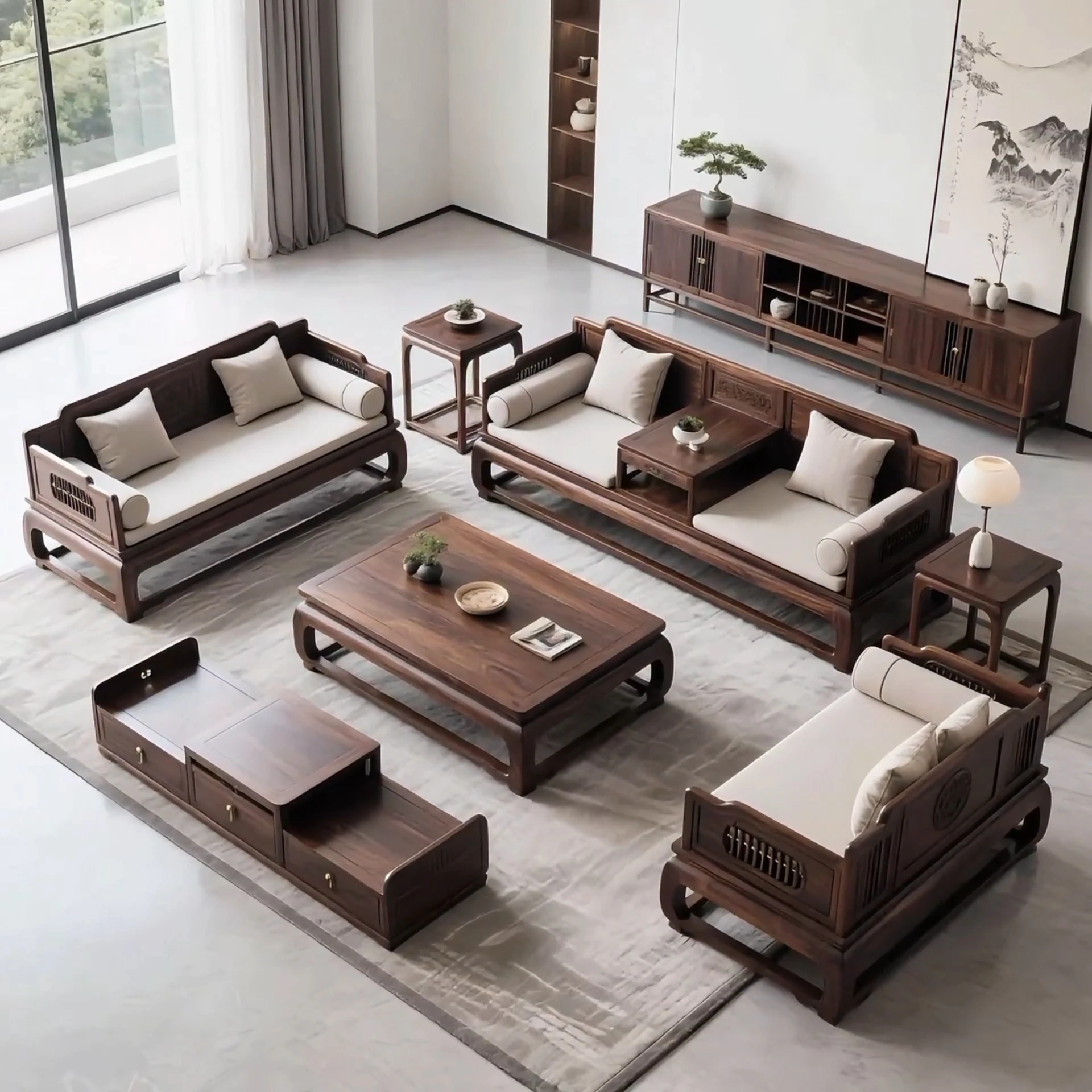新中式ロハンベッドとティーテーブルのセット - 北米産ブラックウォールナット無垢材使用!スタイリッシュで快適なサロン空間を実現。モデルルームや民宿にぴったりの家具!