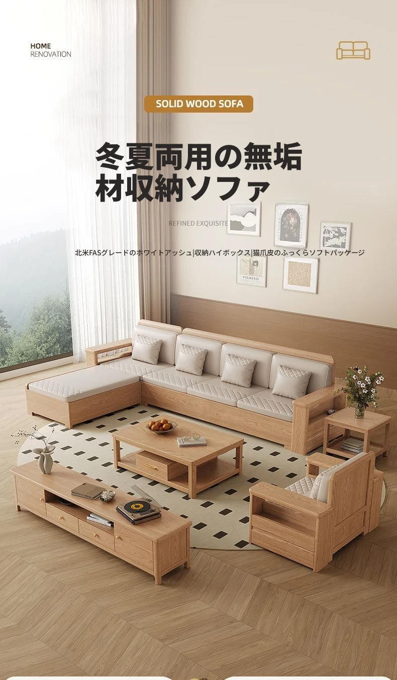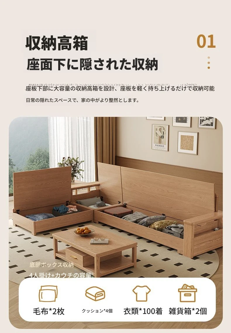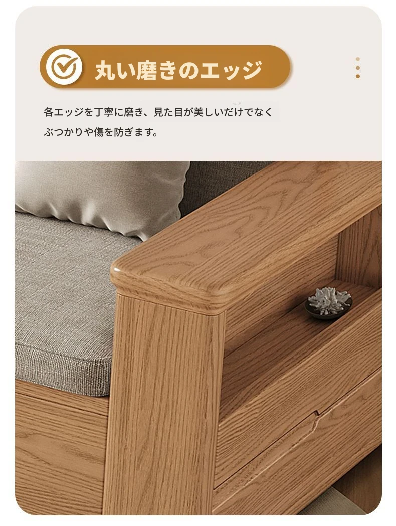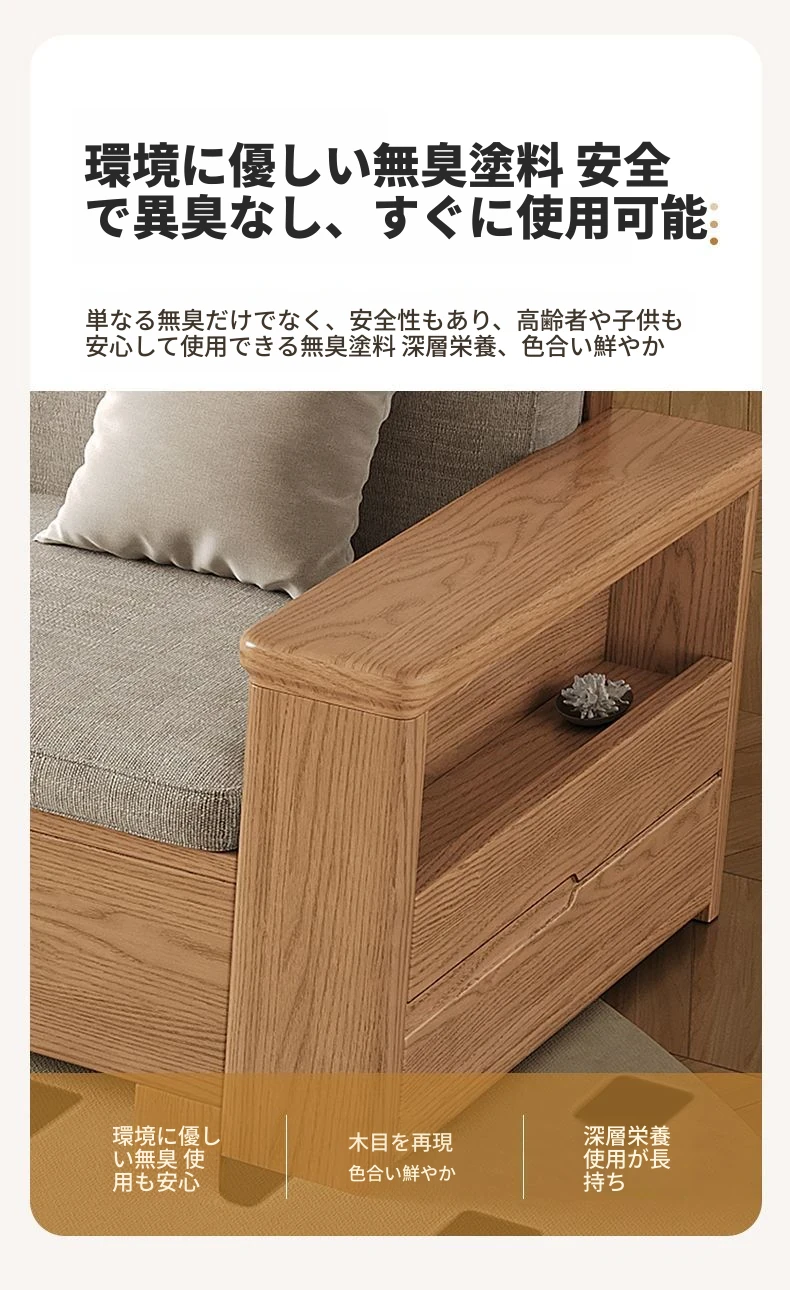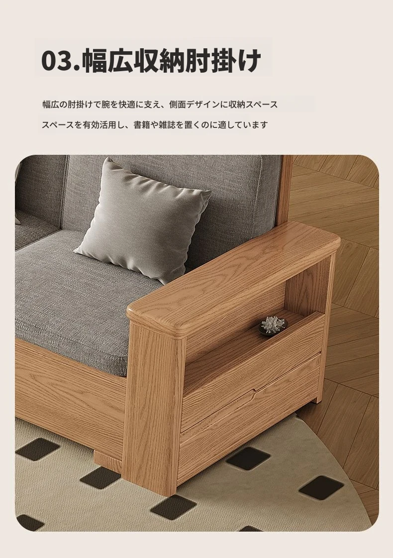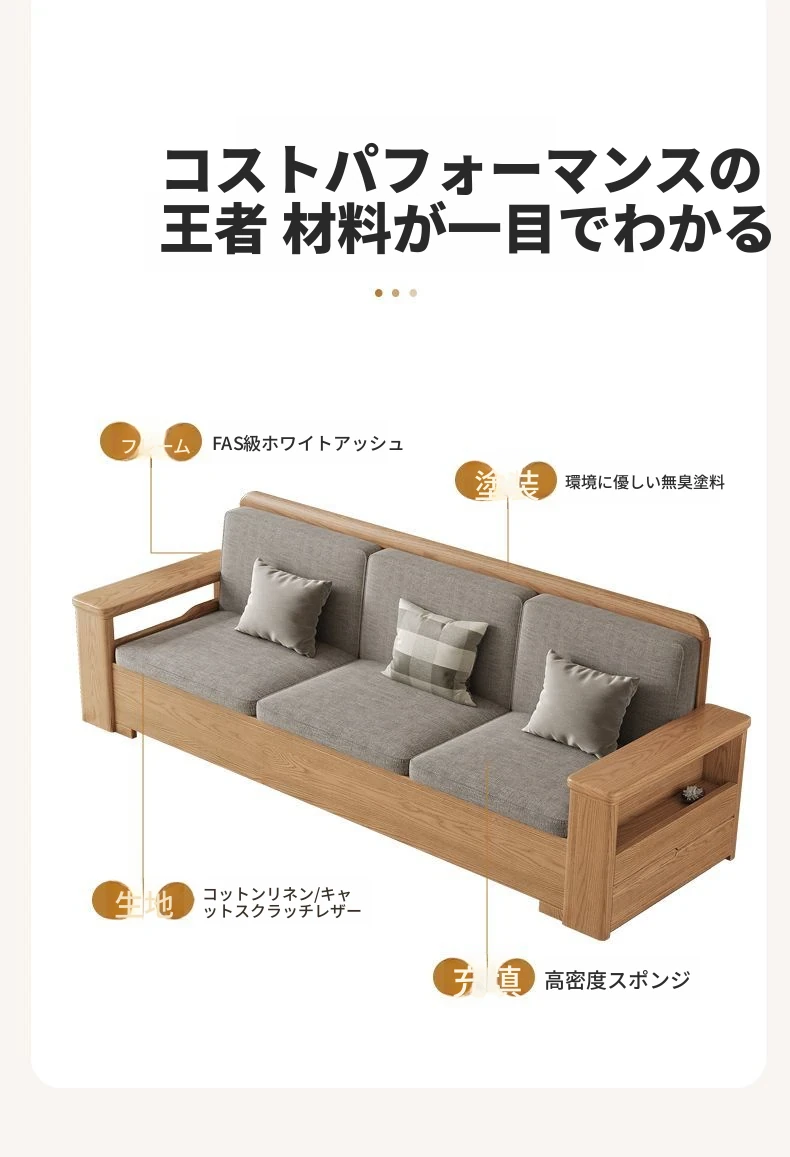 北欧スタイルのホワイトアッシュ無垢材ソファ収納付き!布製のモダンでシンプルなデザイン、小さなリビングにぴったりのナチュラルカラー家具。おしゃれで機能的な空間を演出します!